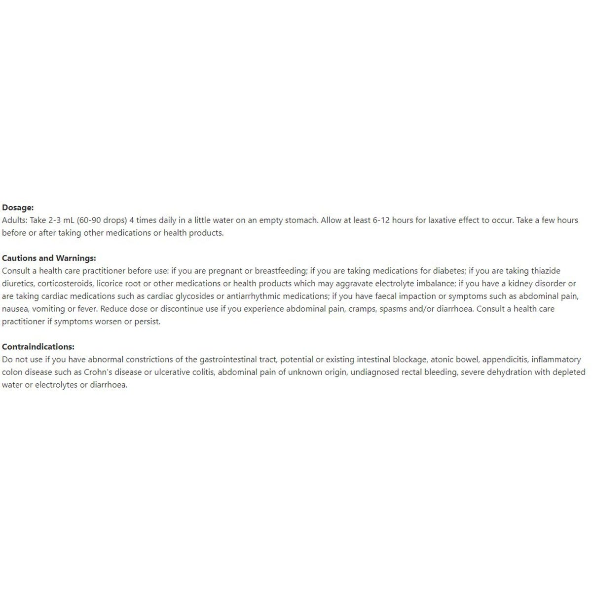 Adults: Take 2-3 mL (60-90 drops) 4 times daily in a little water on an empty stomach. Allow at least 6-12 hours for laxative effect to occur. Take a few hours before or after taking other Health Products or health products.