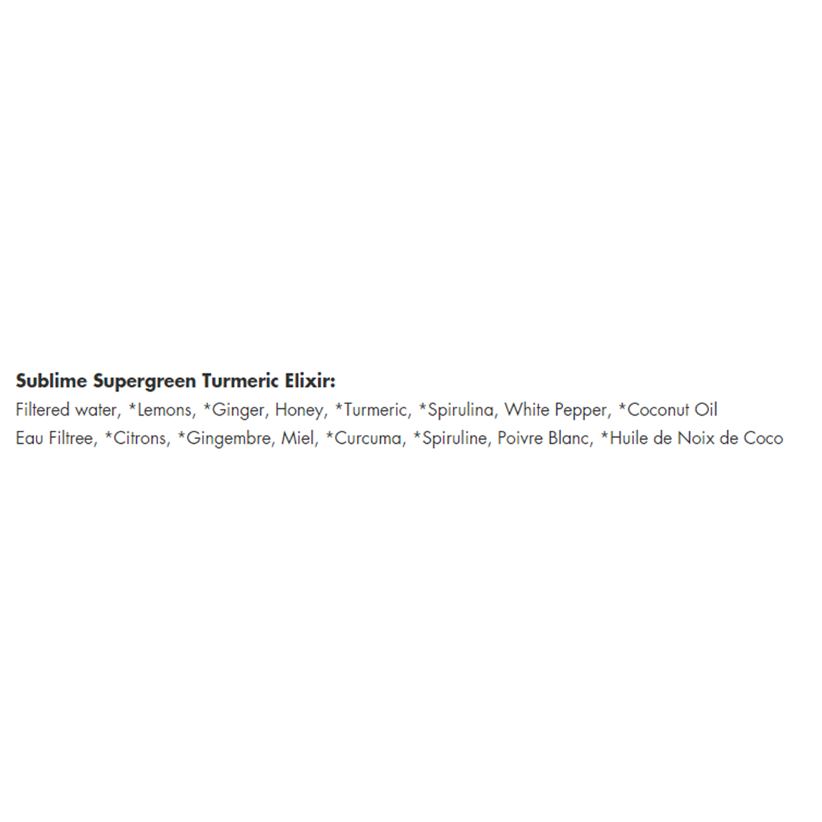 Filtered water, *Lemons, *Ginger, Honey, *Turmeric, *Spirulina, White Pepper, *Coconut Oil.