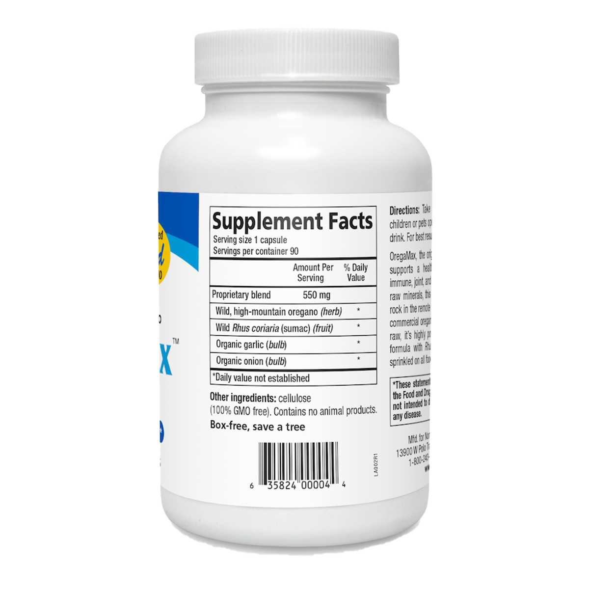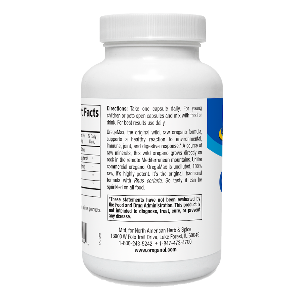 OregaMax, the original wild, raw oregano formula, supports a healthy reaction to environmental, immune, joint, and digestive response. A source of raw minerals, this wild oregano grows directly on rock in the remote Mediterranean mountains. Unlike commercial oregano, OregaMax is undiluted. 100% raw, it's highly potent. It's the original, traditional formula with Rhus coriaria. So tasty it can be sprinkled on all food.