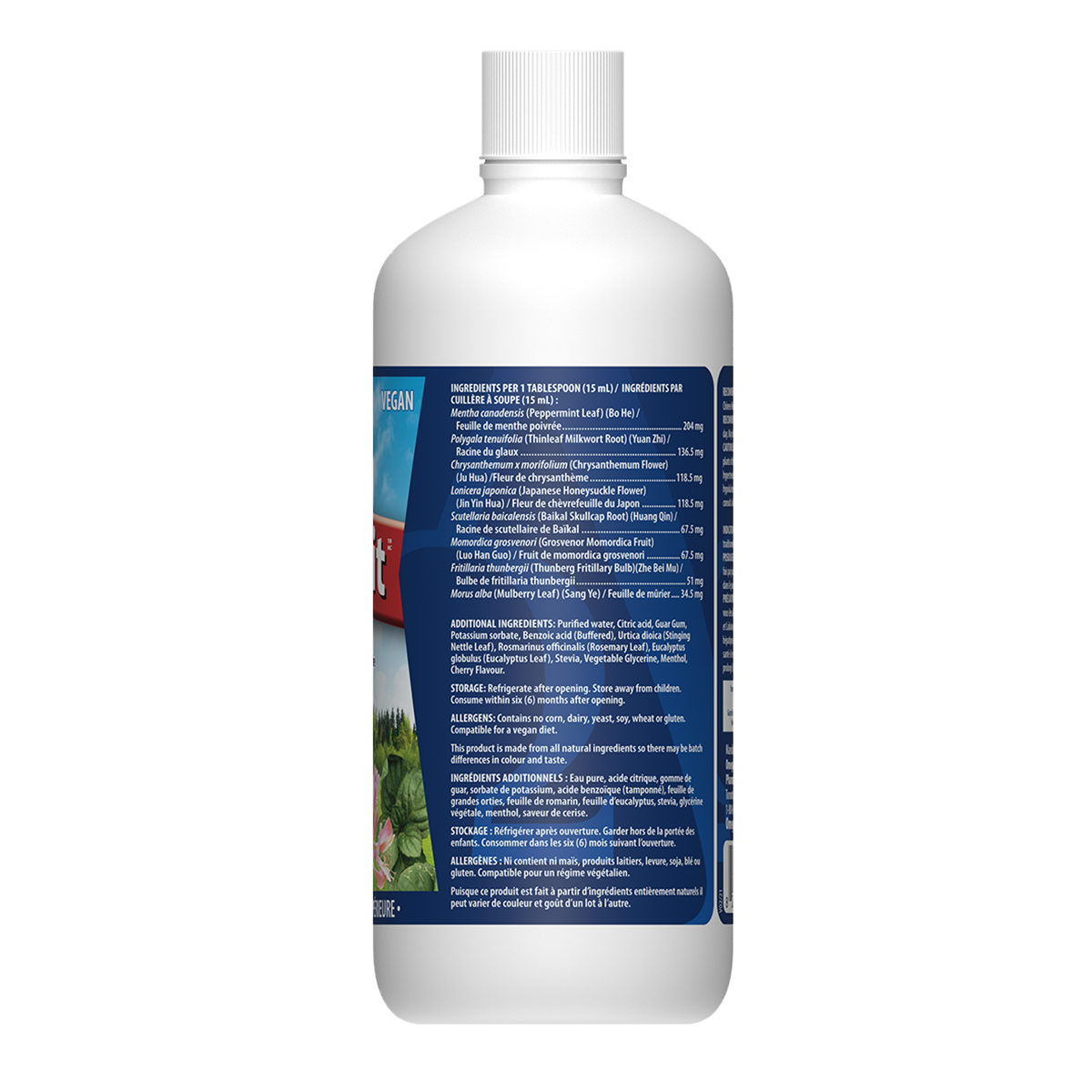 Purified water, Citric acid, Guar Gum, Potassium sorbate, Benzoic acid (Buffered), Urtica dioica (Stinging Nettle Leaf), Rosmarinus officinalis Menthol, Cherry Flavour. (Rosemary Leaf), Eucalyptus globulus (Eucalyptus Leaf), Stevia, Vegetable Glycerine.