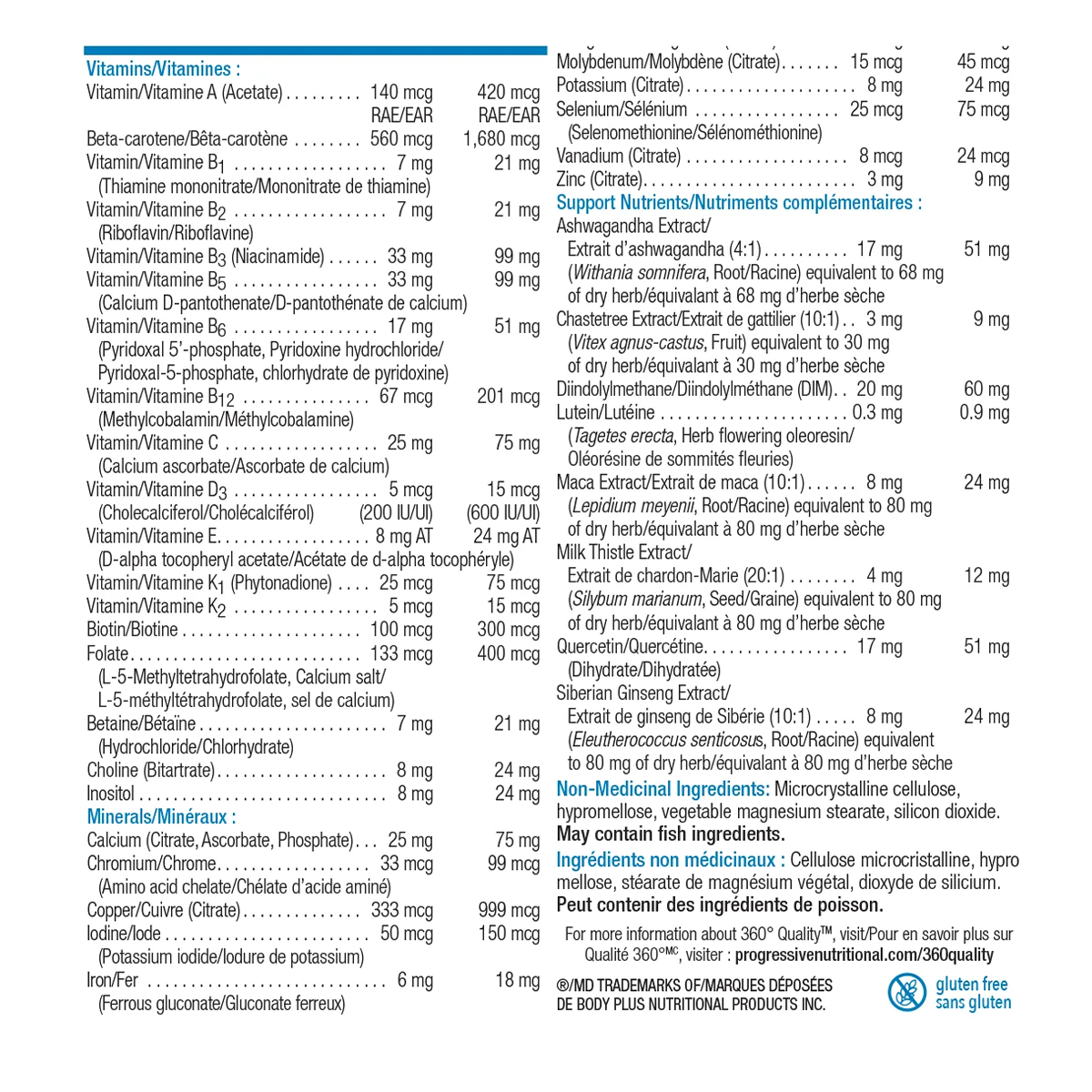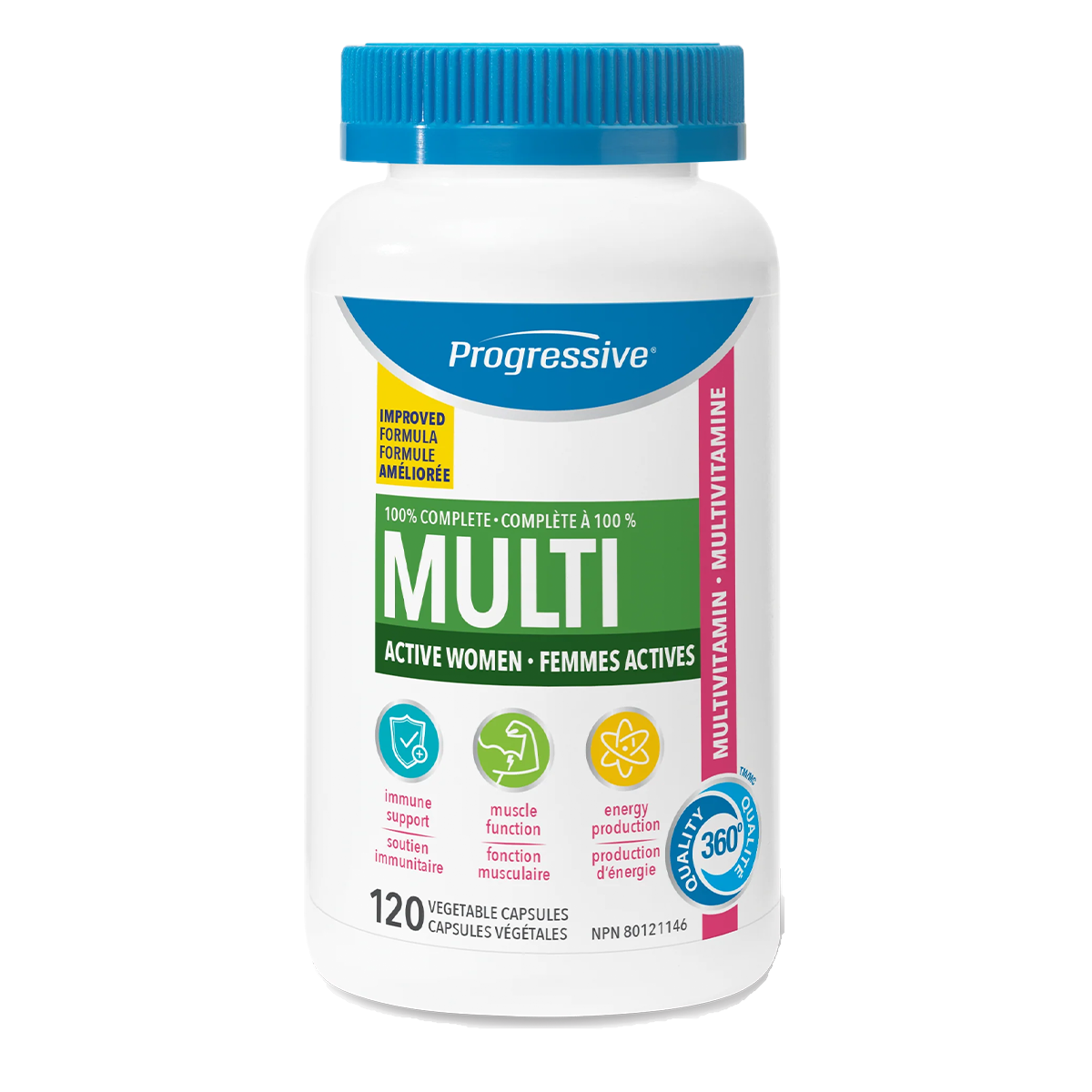 Progressive's 100% Complete MultiVitamin for Active Women is tailored for women with dynamic lifestyles. Whether you're a regular exerciser, work long hours, manage a family, or engage in a combination of activities, your body requires the comprehensive Aid of an Active MultiVitamin formula. This enhanced formulation includes a blend of Aiding nutrients designed to address women’s health needs, including promoting healthy estrogen balance. These Aiding nutrients include Quercetin, DIM, Chastetree, Maca, Ashwagandha, and Siberian Ginseng.