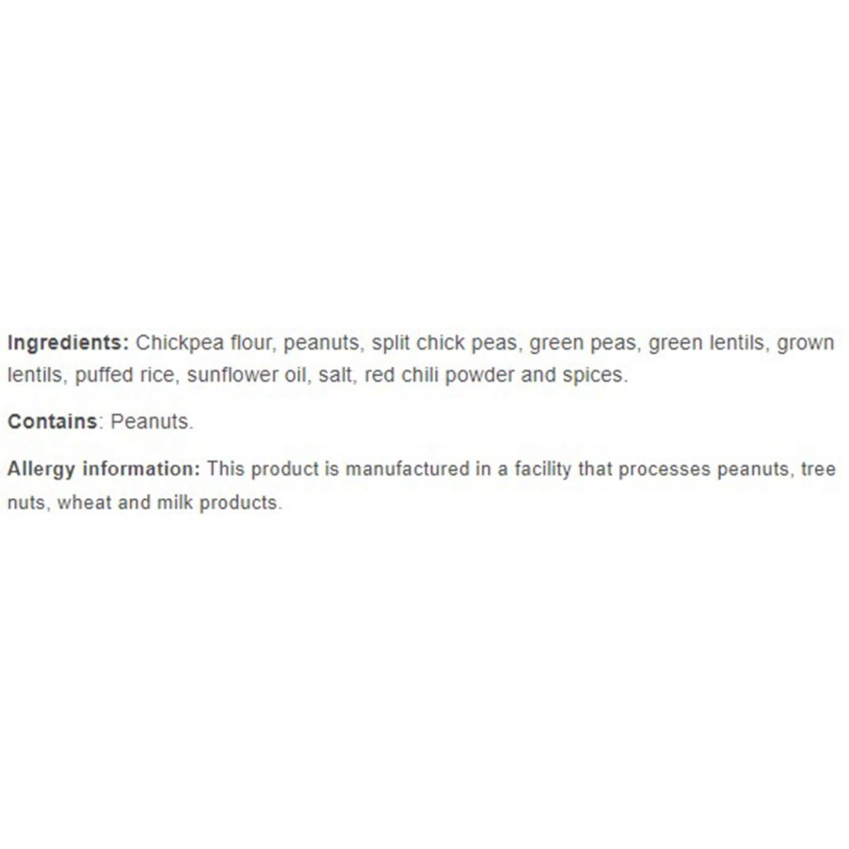 Chickpea flour, peanuts, split chick peas, green peas, green lentils, grown lentils, puffed rice, sunflower oil, salt, red chili powder and spices.
