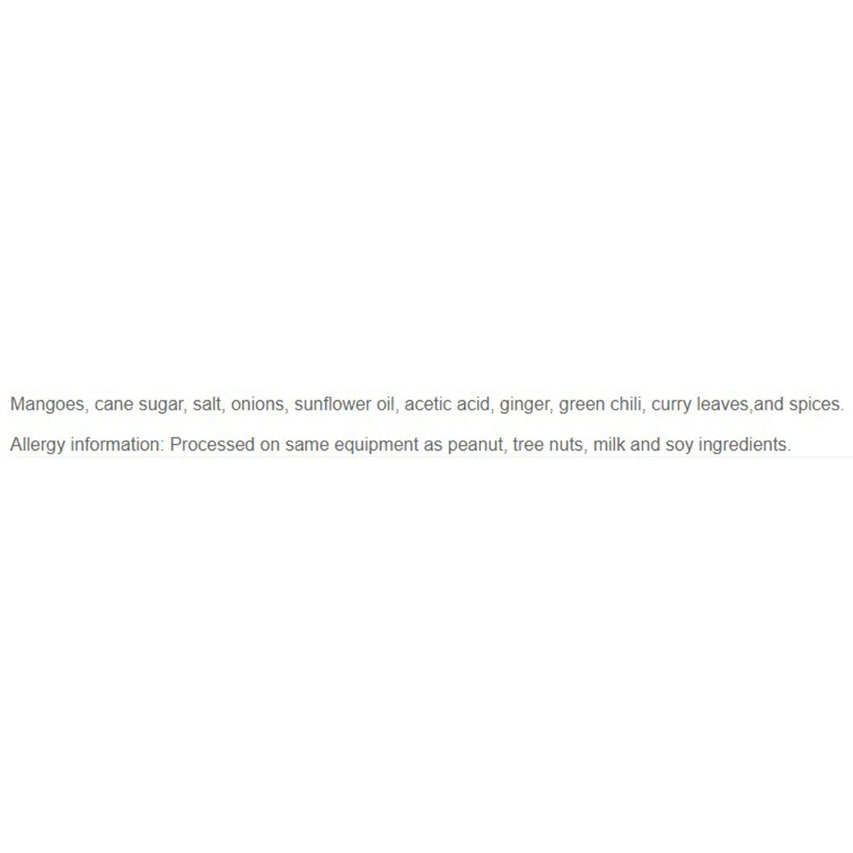 Mangoes, cane sugar, salt, onions, sunflower oil, acetic acid, ginger, green chili, curry leaves, and spices.