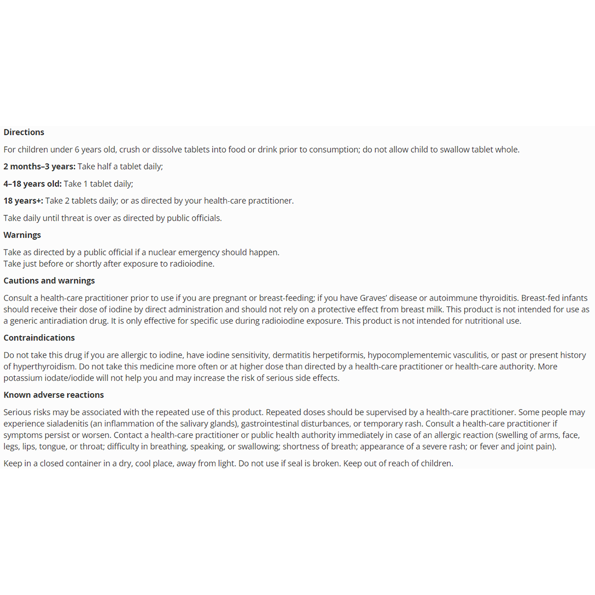 Suitable for thyroid prote-ction due to radioactive iodine exposure. Includes age group–specific dosage information. Not for daily use; for nuclear emergency use only.