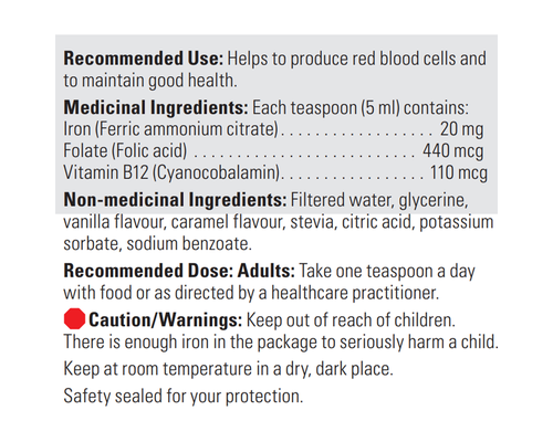 Liquid Iron is used to Assist maintain healthy physiological iron stores. This non-constipating citrate form of iron has been blended with Vitamin B12 and folic acid in a pleasant-tasting vanilla flavoured liquid.