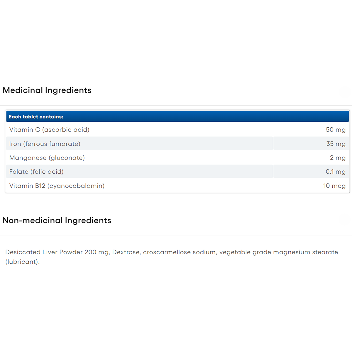Desiccated Liver Powder 200 mg, Dextrose, croscarmellose sodium, vegetable grade magnesium stearate (lubricant).