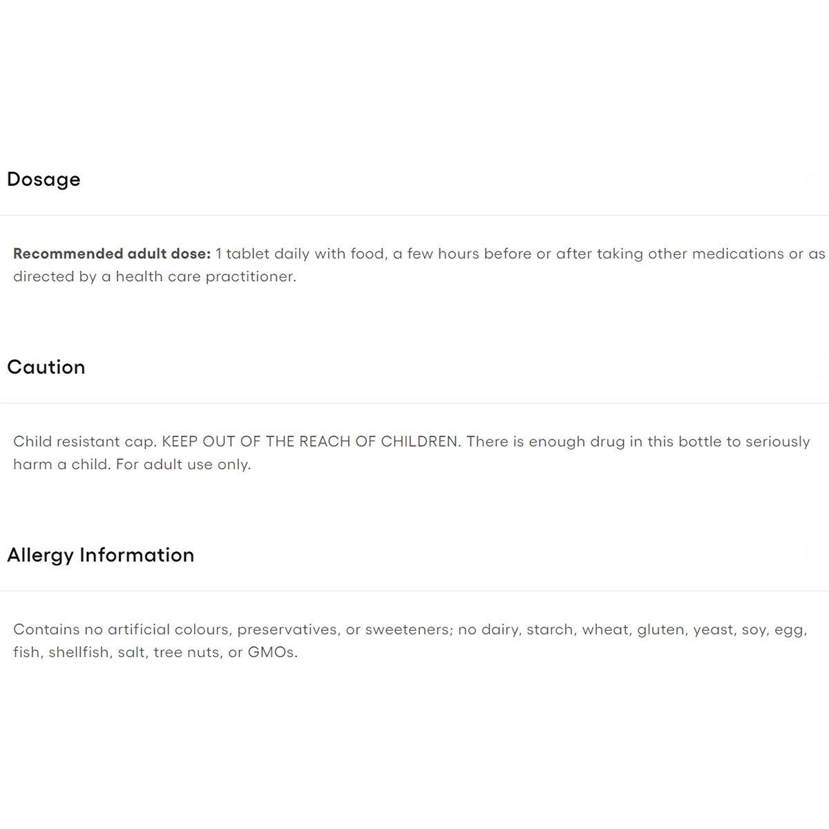 Contains no artificial colours, preservatives, or sweeteners; no dairy, starch, wheat, gluten, yeast, soy, egg, fish, shellfish, salt, tree nuts, or GMOs.