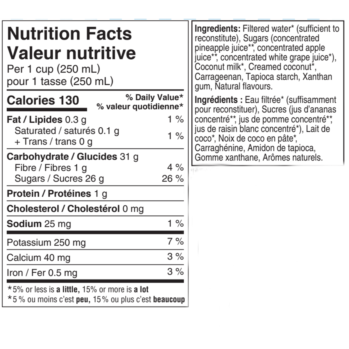 Filtered water* (sufficient to reconstitute), Sugars (concentrated pineapple juice**, concentrated apple juice**, concentrated white grape juice*), Coconut milk*, Creamed coconut*, Carrageenan, Tapioca starch, Xanthan gum, Natural flavours.
