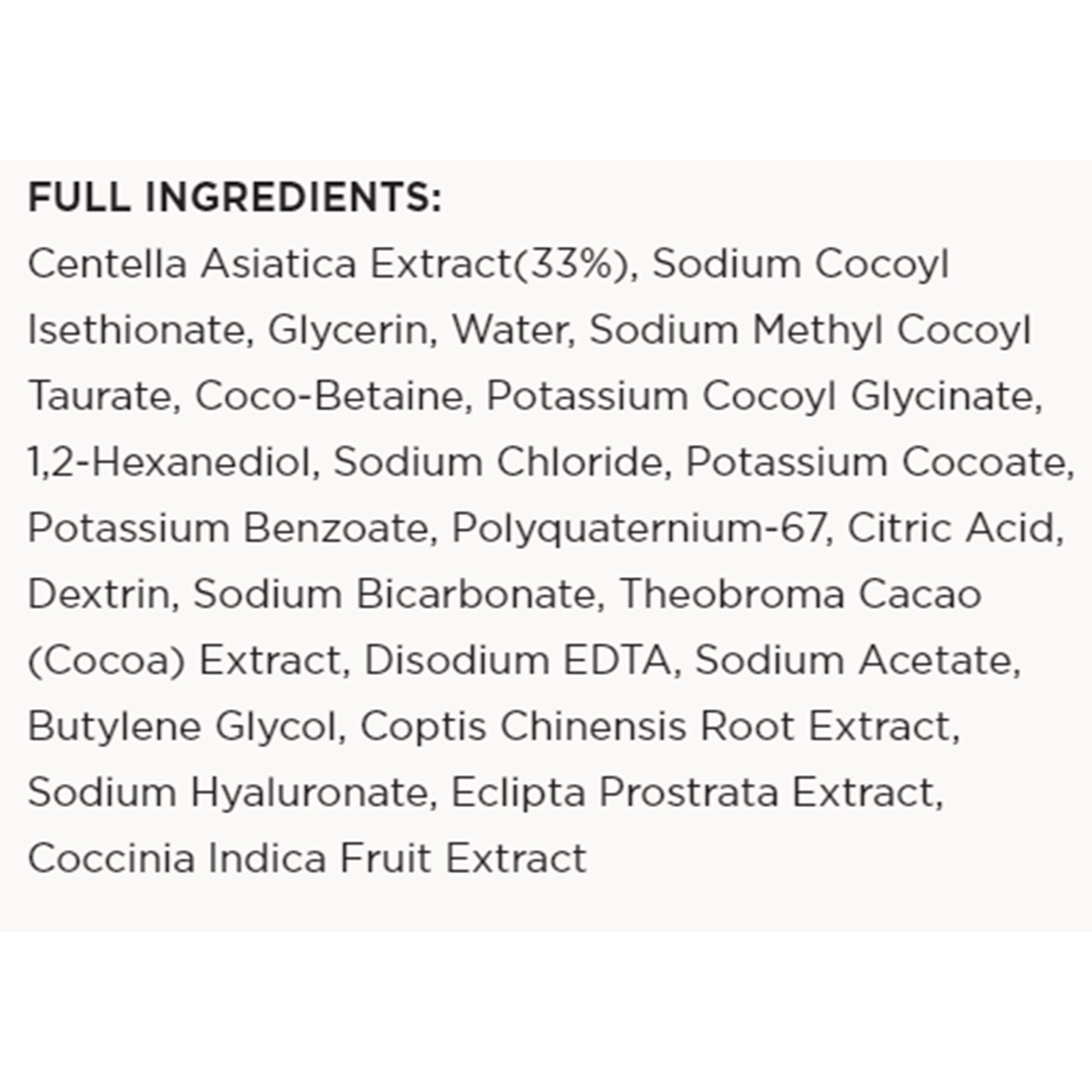 Centella Asiatica Extract(33%), Sodium Cocoyl Isethionate, Glycerin, Water, Sodium Methyl Cocoyl Taurate, Coco-Betaine, Potassium Cocoyl Glycinate, 1,2-Hexanediol, Sodium Chloride, Potassium Cocoate, Potassium Benzoate, Polyquaternium-67, Citric Acid, Dextrin, Sodium Bicarbonate, Theobroma Cacao (Cocoa) Extract, Disodium EDTA, Sodium Acetate, Butylene Glycol, Coptis Chinensis Root Extract, Sodium Hyaluronate, Eclipta Prostrata Extract, Coccinia Indica Fruit Extract.