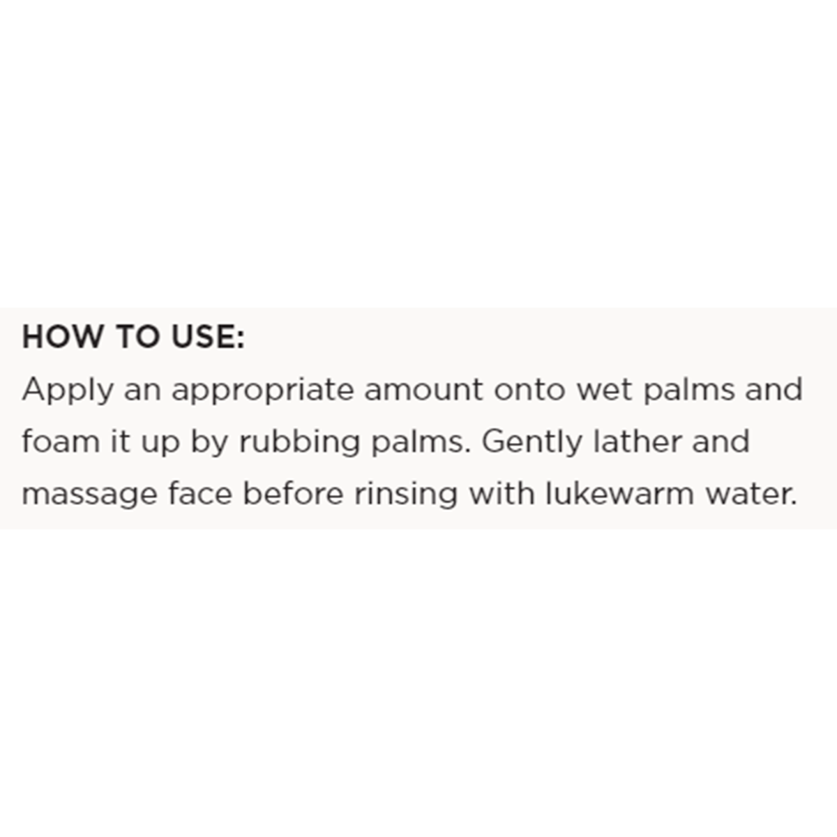 Apply an appropriate amount onto wet palms and foam it up by rubbing palms. Gently lather and massage face before rinsing with lukewarm water.