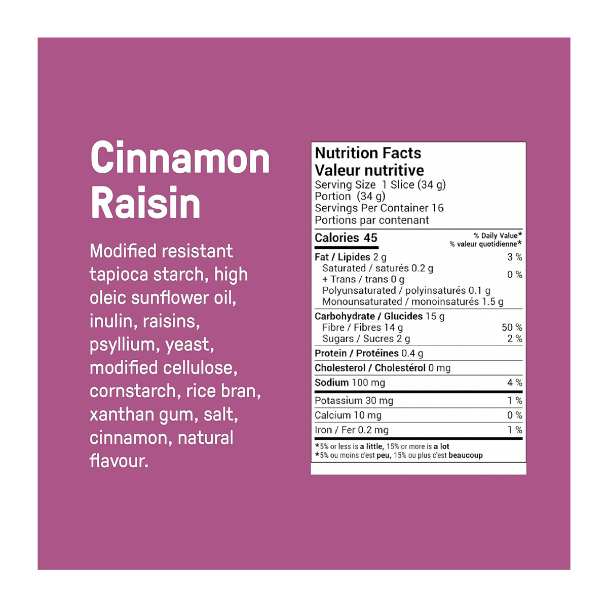 Modified resistant tapioca starch, high oleic sunflower oil, inulin, raisins, psyllium, yeast, modified cellulose, cornstarch, rice bran, xanthan gum, salt, cinnamon, natural flavour.