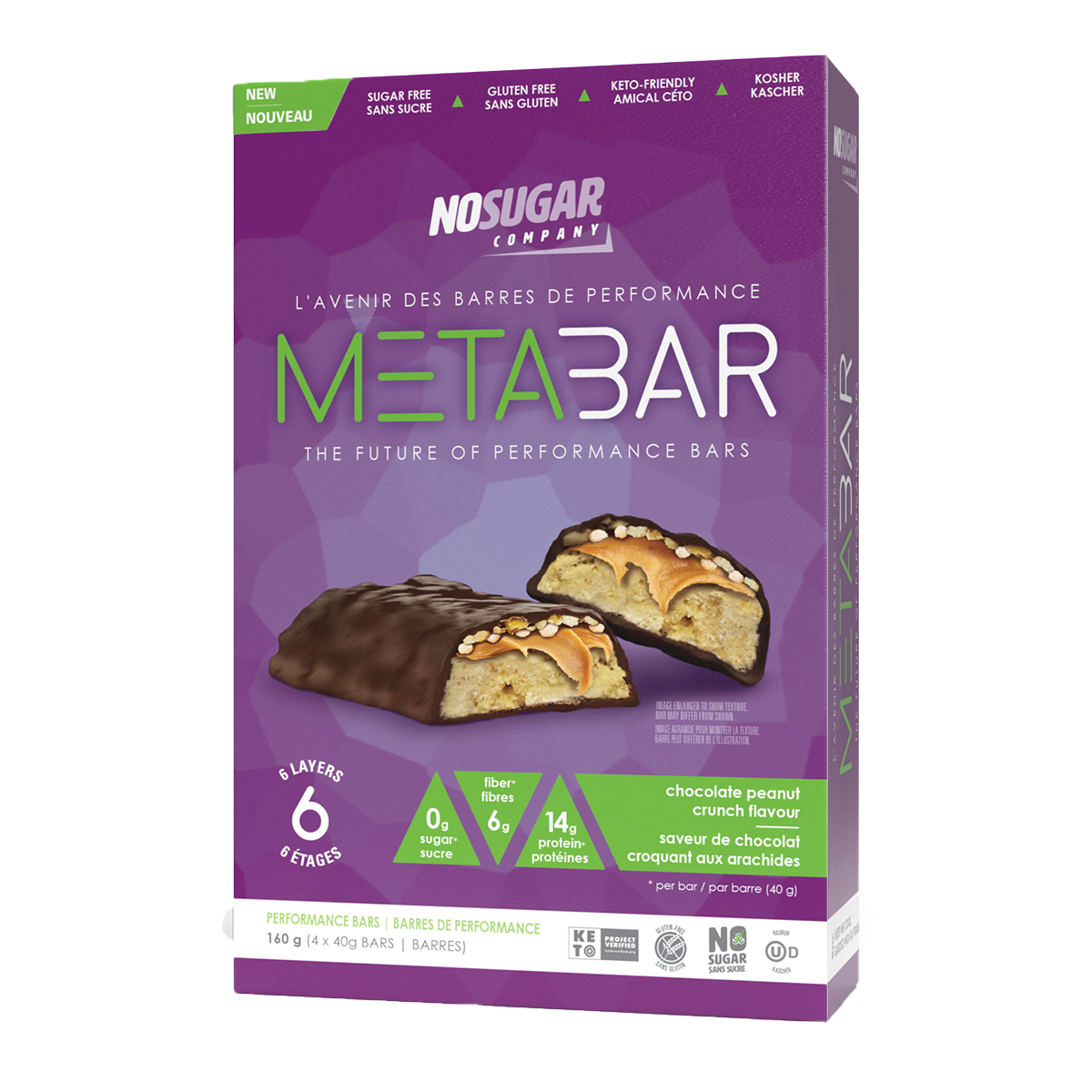 Are you in search of a scrumptious yet wholesome snack? Look no further than the NO SUGAR METABAR Chocolate Peanut Crunch, a revolutionary performance bar that boasts six layers of indulgence: gooey peanut butter, crunchy peanuts, whey protein crisps, soft nougat cookie, dark chocolate base and topped with a dark chocolatey coating. Each METABAR has 14g of protein and low net carbs. What's more, it contains absolutely no sugar!