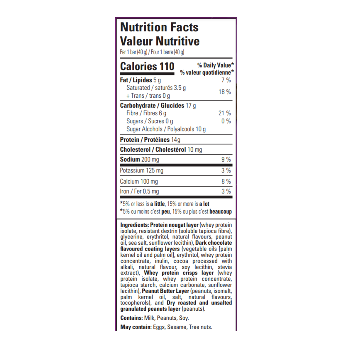Protein nougat layer (whey protein isolate, resistant dextrin (soluble tapioca fibre), glycerine, erythritol, natural flavours, peanut oil, sea salt, sunflower lecithin), Dark chocolate flavoured coating layers (vegetable oils [palm kernel oil and palm oil], erythritol, whey protein concentrate, inulin, cocoa processed with alkali, natural flavour, soy lecithin, stevia extract), Whey protein crisps layer (whey protein isolate, whey protein concentrate, tapioca starch, calcium carbonate, sunflower lecithin), Peanut Butter Layer (peanuts, isomalt, palm kernel oil, salt, natural flavours, tocopherols), and Dry roasted and unsalted granulated peanuts layer.