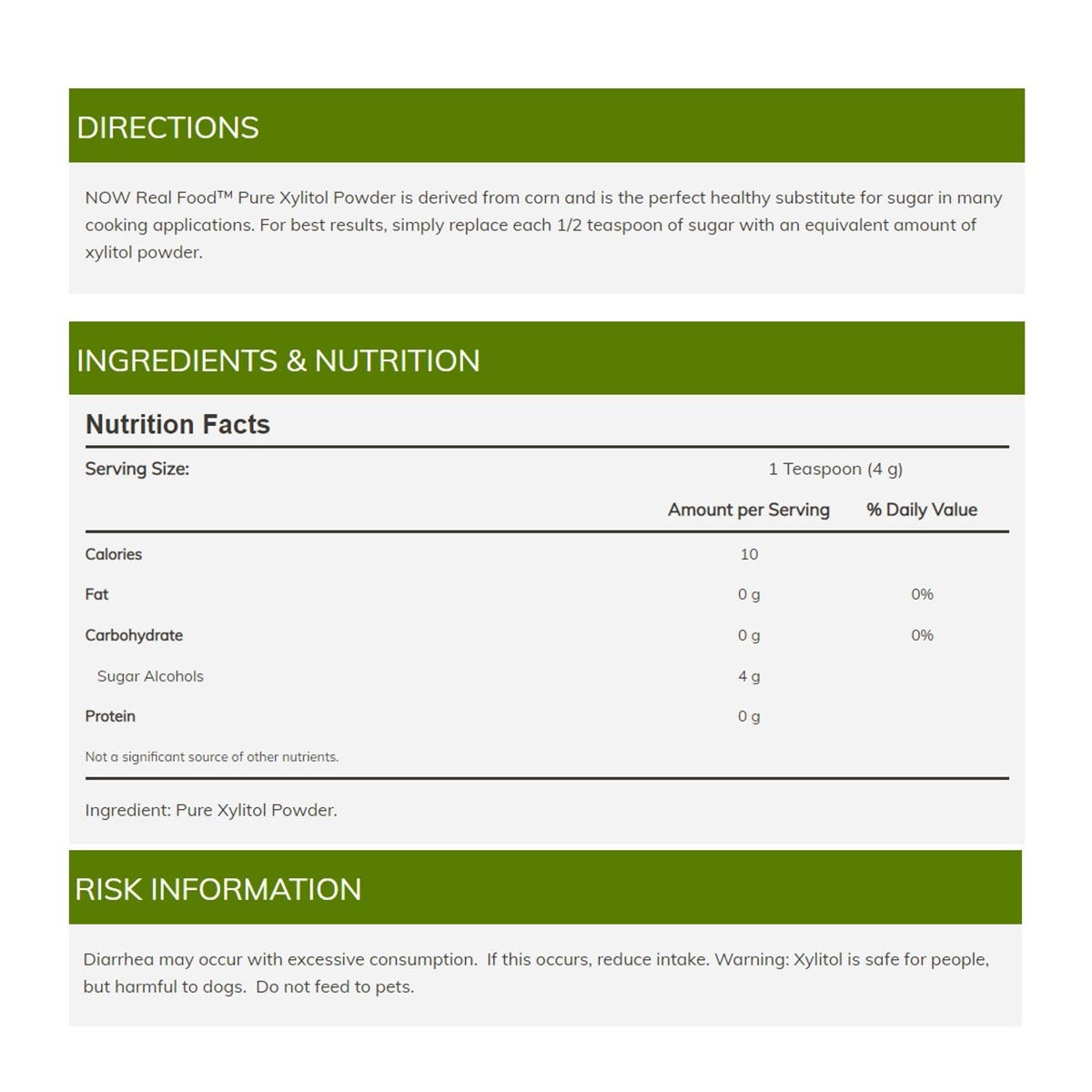 NOW Real Food Pure Xylitol Powder is derived from corn and is the perfect healthy substitute for sugar in many cooking applications. For best results, simply replace each 1/2 teaspoon of sugar with an equivalent amount of xylitol powder.