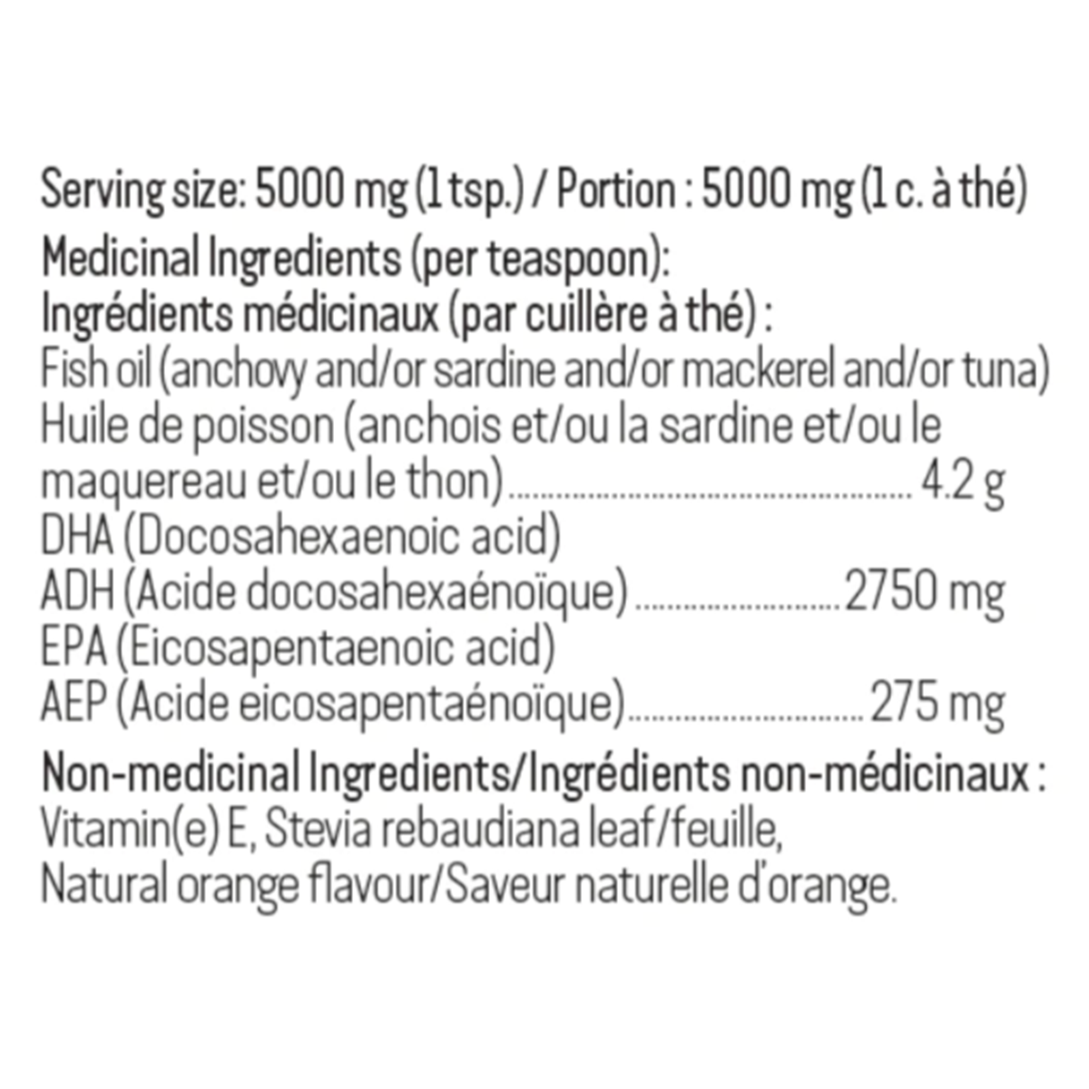 Vitamin(e) E, Stevia rebaudiana leaf/feuille, Natural orange flavour/Saveur naturelle d'orange.