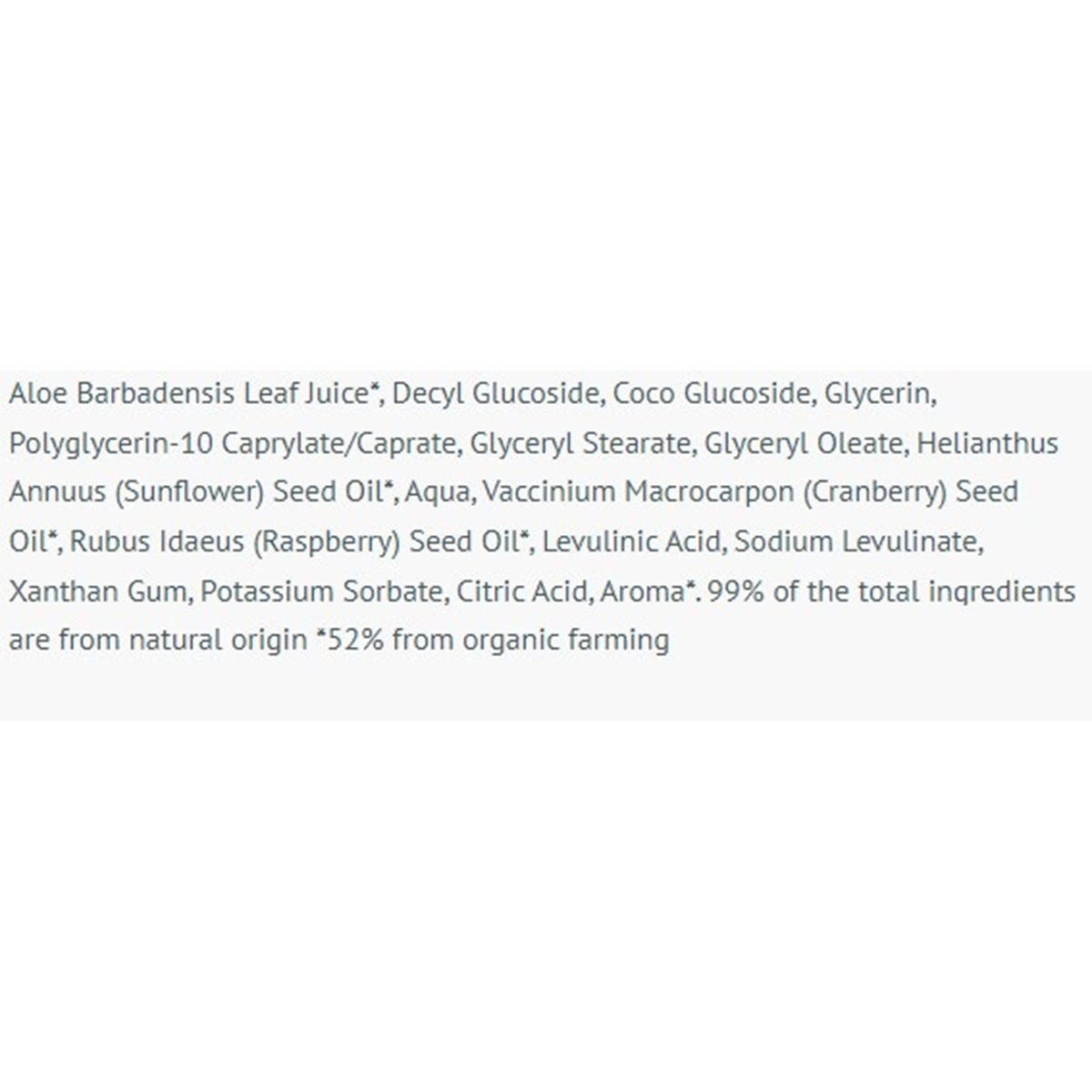 Aloe Barbadensis Leaf Juice*, Decyl Glucoside, Coco Glucoside, Glycerin, Polyglycerin-10 Caprylate/Caprate, Glyceryl Stearate, Glyceryl Oleate, Helianthus Annuus (Sunflower) Seed Oil*, Aqua, Vaccinium Macrocarpon (Cranberry) Seed Oil*, Rubus Idaeus (Raspberry) Seed Oil*, Levulinic Acid, Sodium Levulinate, Xanthan Gum, Potassium Sorbate, Citric Acid, Aroma*.