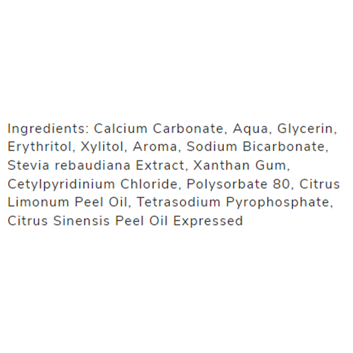 Calcium Carbonate, Aqua, Glycerin, Erythritol, Xylitol, Aroma, Sodium Bicarbonate, Stevia rebaudiana Extract, Xanthan Gum, Cetylpyridinium Chloride, Polysorbate 80, Citrus Limonum Peel Oil, Tetrasodium Pyrophosphate, Citrus Sinensis Peel Oil Expressed.