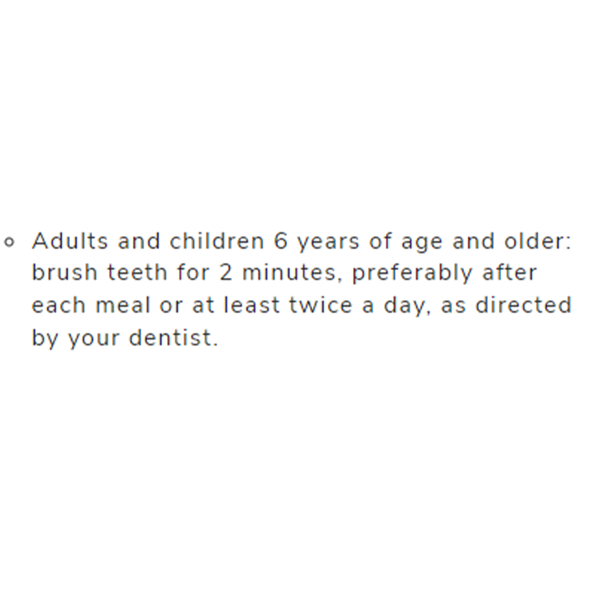 Adults and children 6 years of age and older: brush teeth for 2 minutes, preferably after each meal or at least twice a day, as directed by your dentist.