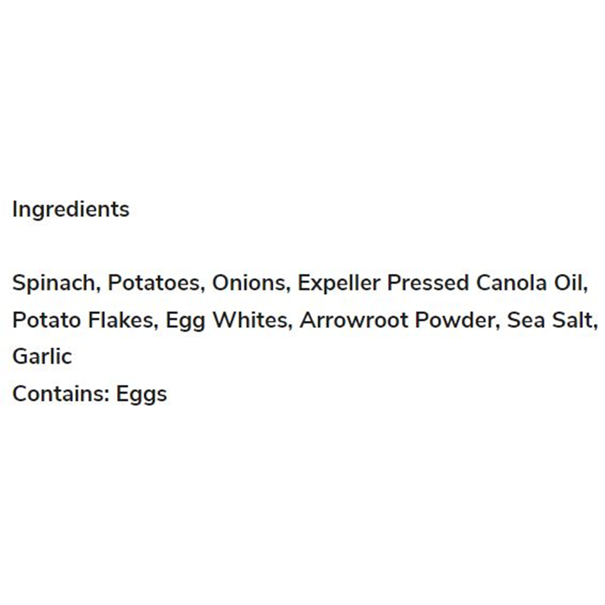 Spinach, Potatoes, Onions, Expeller Pressed Canola Oil, Potato Flakes, Egg Whites, Arrowroot Powder, Sea Salt, Garlic.