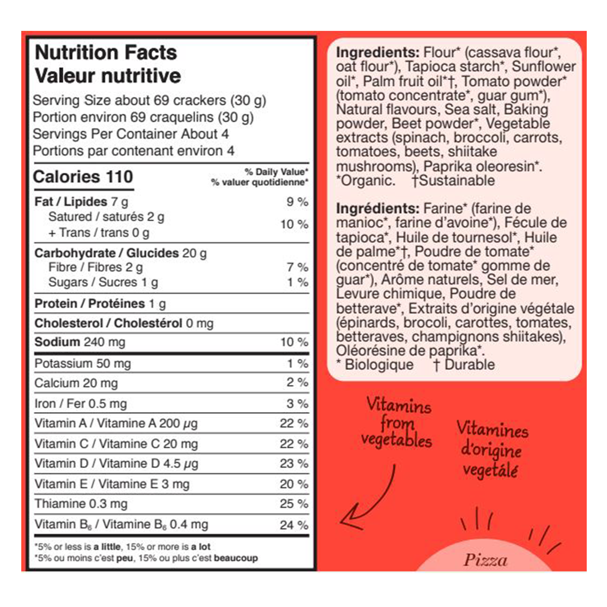 Flour* (cassava flour*, oat four*), Tapioca starch*, Sun fower oil*, Palm fruit oil†, Tomato powder (tomato concentrate*, guar gum*), Natural favours, Sea salt, Baking powder, Beet powder*, Vegetable extracts (spinach, broccoli, carrots, tomatoes, beets, shiitake mushrooms), Paprika oleoresin*. *Organic. †Sustainable