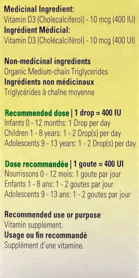 Efficacy: Delivers 400 IU Vitamin D3 per drop.