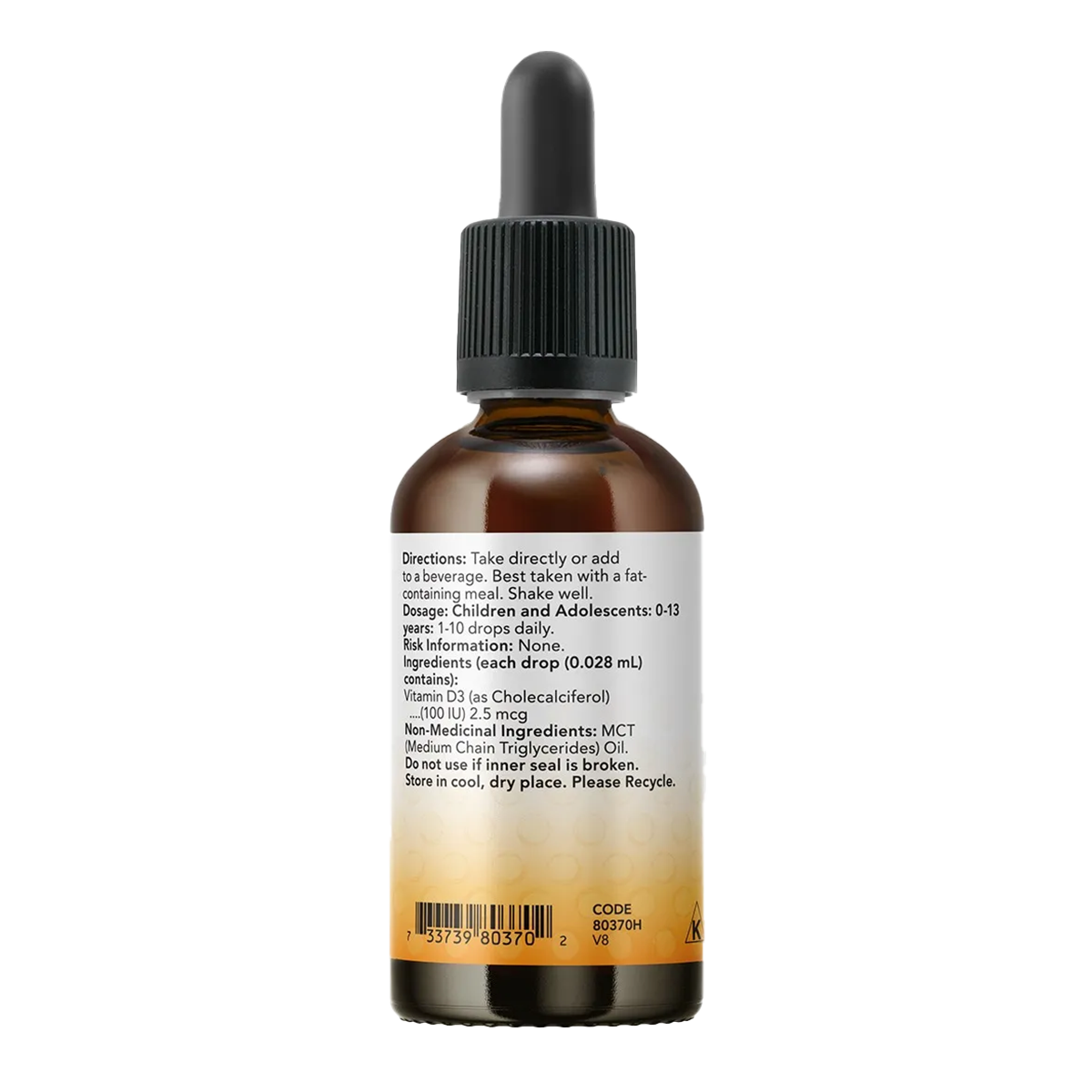 NOW Kids Vitamin D-3 Liquid provides a highly absorbable format that can easily be taken directly from the dropper or added to beverages. Made with a MCT (Medium chain triglycerides) oil base, which flavourless, making it suitable for infants, fussy eaters up to adolescents.
