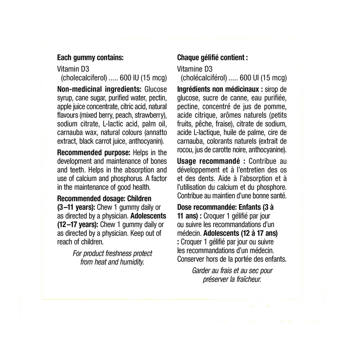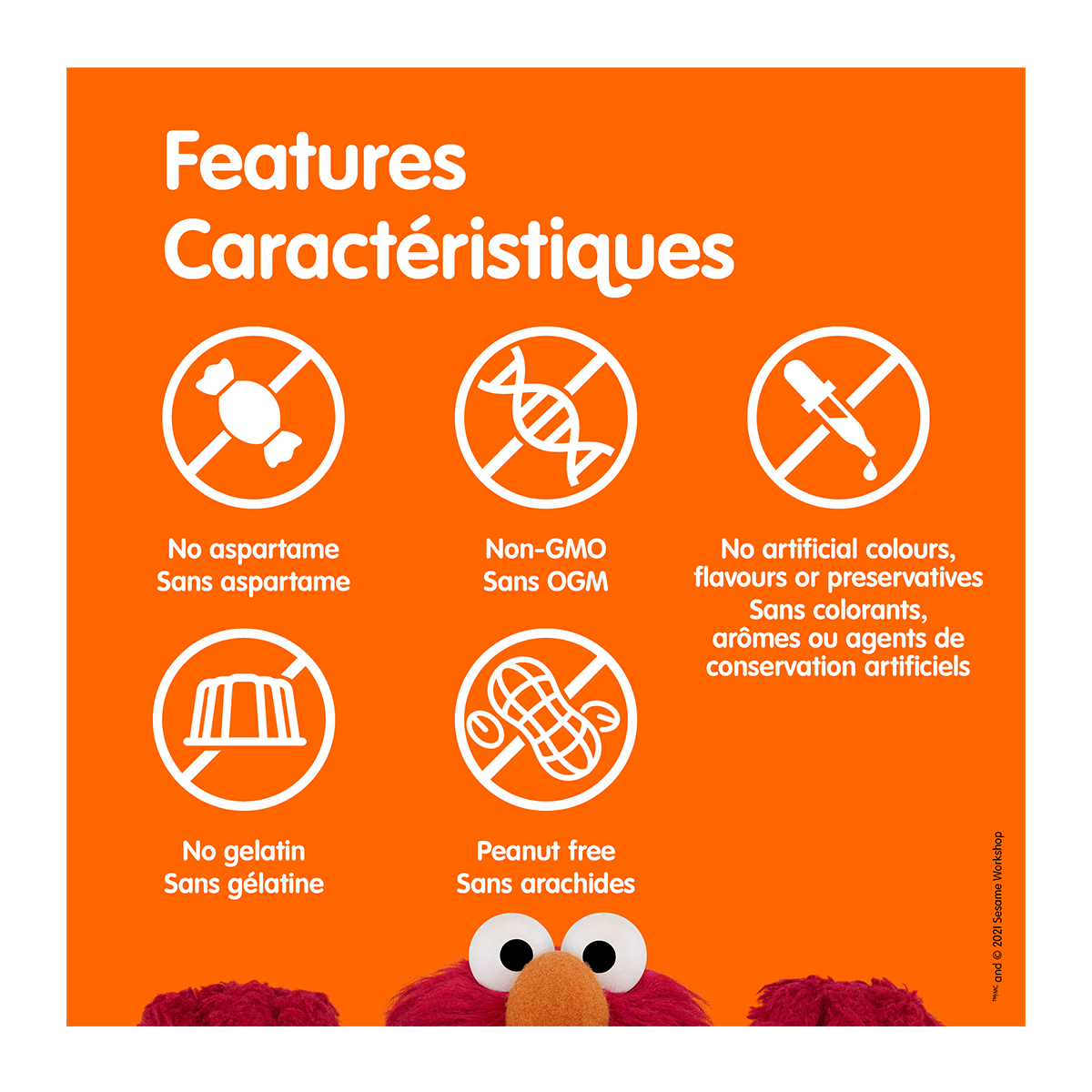 Sesame Street encourages healthy habits in a fun and simple way. This new line of yummy gummies is made especially for children ages 3 and up. Each naturally flavoured mixed berry, peach, and strawberry gummy delivers 600IU of vitaminD3 to ensure an adequate intake every day. D3 (cholecalciferol) is the same form of vitaminD the body makes when exposed to sunshine and is a preferred supplementation choice over the D2 form. Parents will love that the gummies are free of artificial colours and flavours, and children will look forward to the delicious fruit taste. They are a fantastic choice for children who do not drink milk and who love Sesame Street.