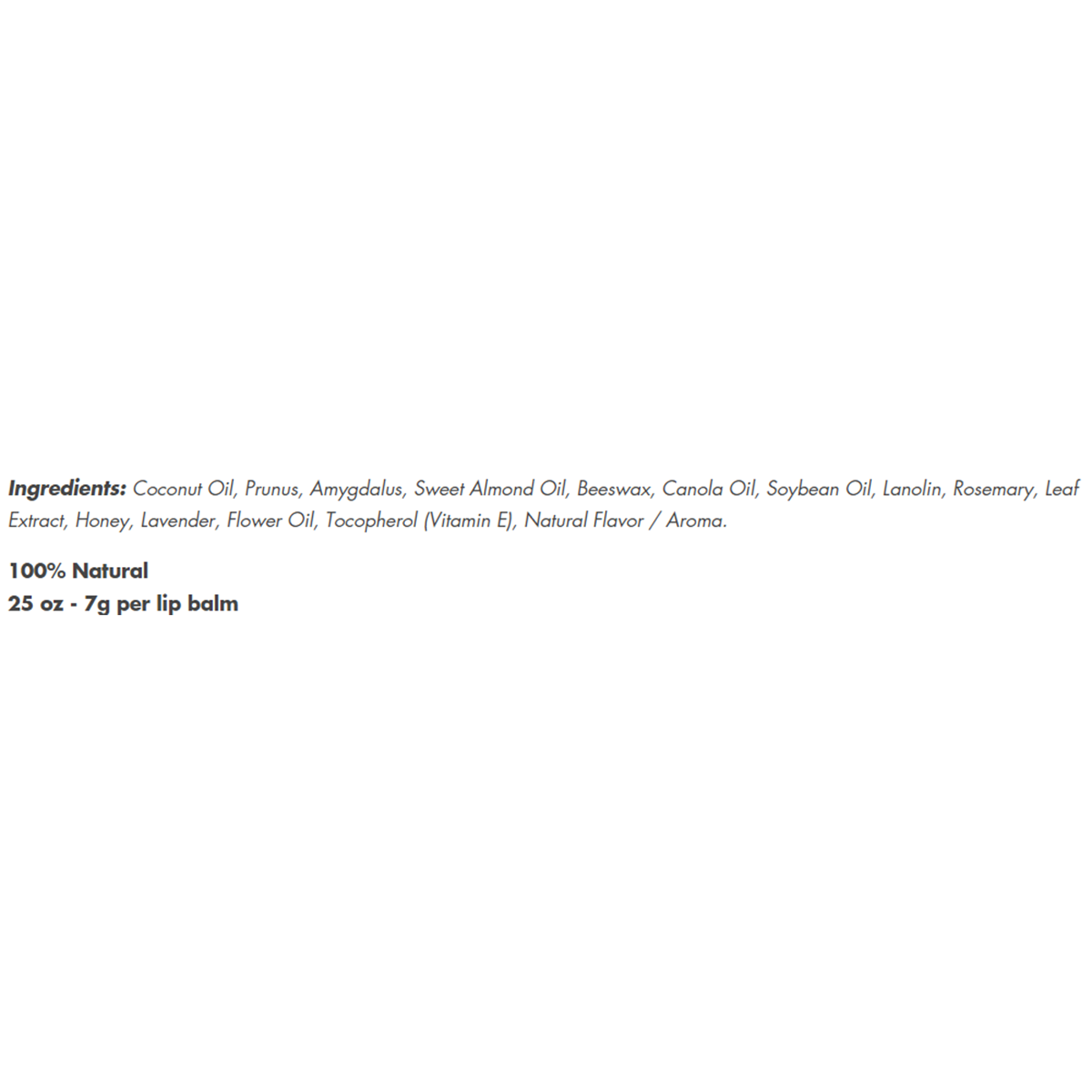 Coconut Oil, Prunus, Amygdalus, Sweet Almond Oil, Beeswax, Canola Oil, Soybean Oil, Lanolin, Rosemary, Leaf Extract, Honey, Lavender, Flower Oil, Tocopherol (Vitamin E), Natural Flavor / Aroma.