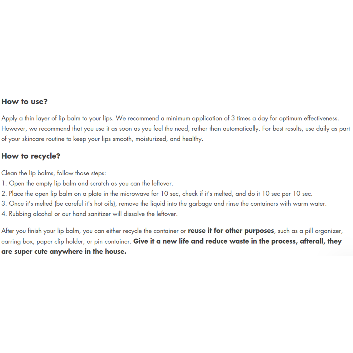 Apply a thin layer of lip balm to your lips. We recommend a minimum application of 3 times a day for optimum effectiveness. However, we recommend that you use it as soon as you feel the need, rather than automatically. For best results, use daily as part of your skincare routine to keep your lips smooth, moisturized, and healthy.