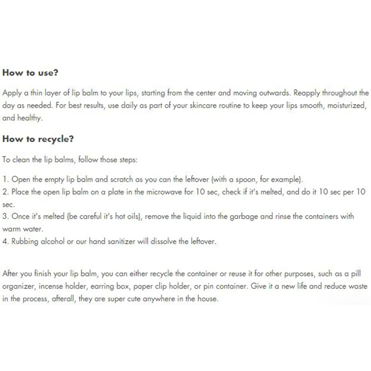 Apply a thin layer of lip balm to your lips, starting from the center and moving outwards. Reapply throughout the day as needed. For best results, use daily as part of your skincare routine to keep your lips smooth, moisturized, and healthy.