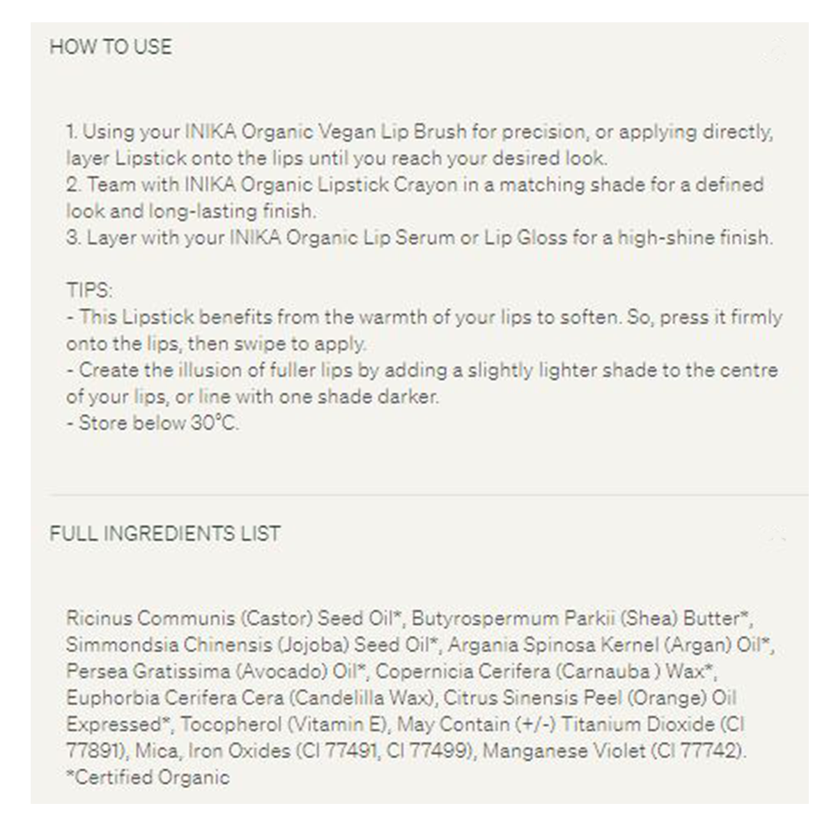 A creamy organic lipstick that softens and hydrates. Accentuate lips with rich colour while nourishing with this 100% Vegan Lipstick. INIKA Organic Lipstick provides lasting hydration and Safeguardion from harmful elements thanks to Certified Organic botanical extracts while imparting luscious, long-lasting pigment.