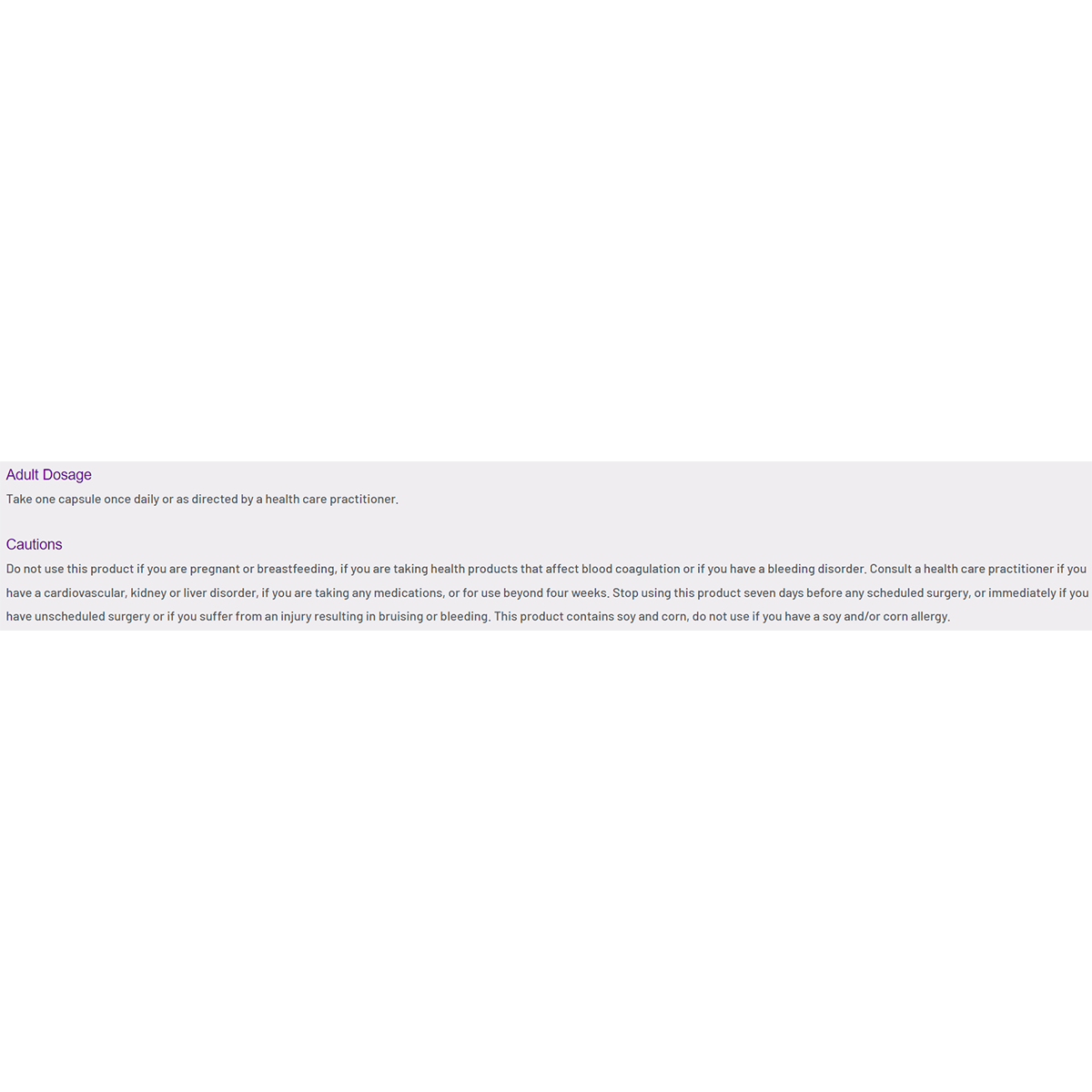 Do not use this product if you are pregnant or breastfeeding, if you are taking health products that affect blood coagulation or if you have a bleeding disorder. Consult a health Wellness-Care practitioner if you have a cardiovascular, kidney, or liver disorder, if you are taking any Health Products, or for use beyond 4 weeks. Stop using this product 7 days before any scheduled surgery, or immediately if you have unscheduled surgery or if you suffer from an injury resulting in bruising or bleeding. This product contains soy and corn, do not use if you have soy and/or corn allergy.