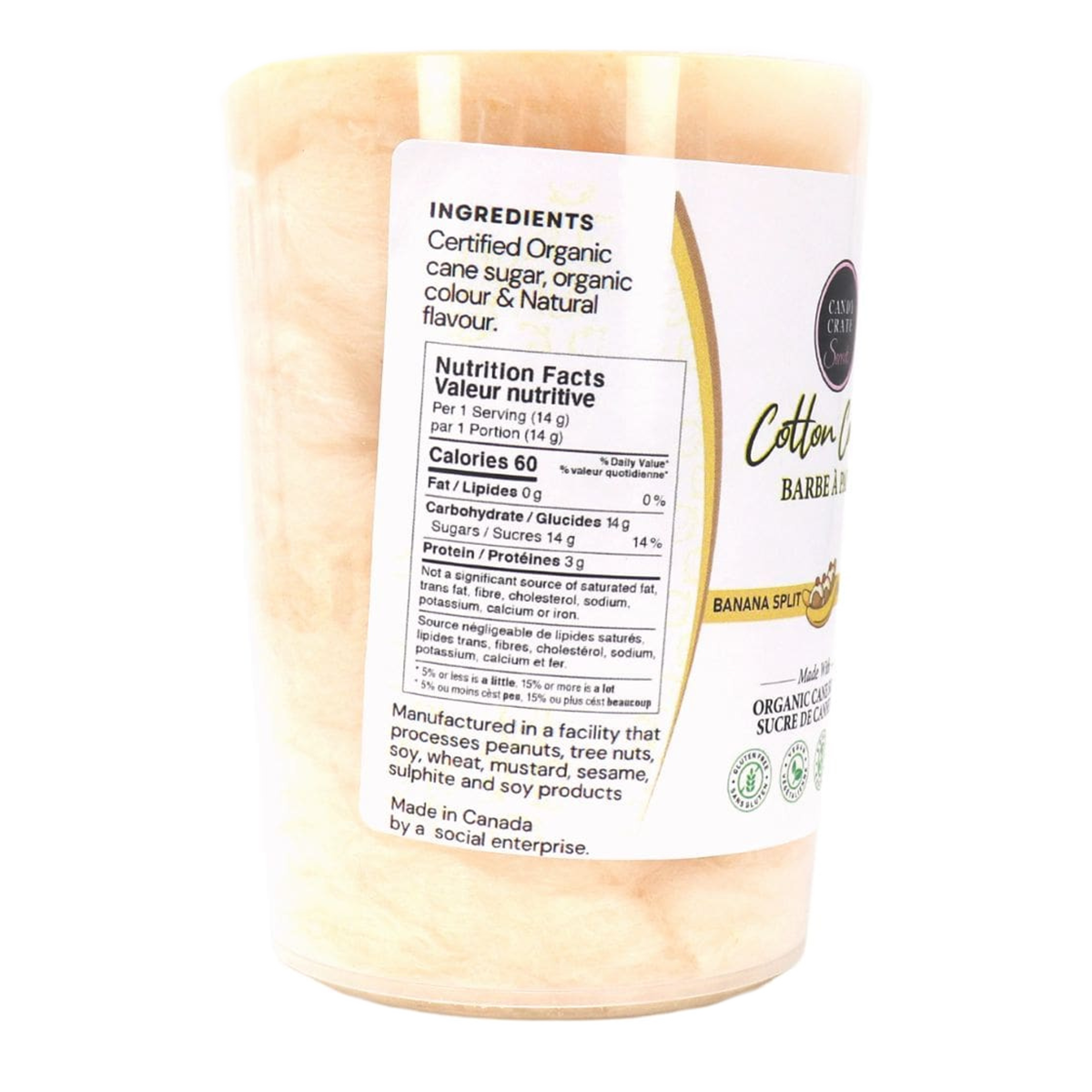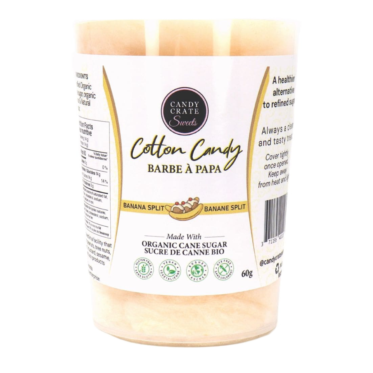 Get ready for a burst of nostalgia with a taste that'll make you go bananas! Candy Crate has recreated the classic banana split in this melt-in-your-mouth organic cotton candy. Featuring creamy vanilla, velvety chocolate, and ripe banana slices, this cotton candy will transport you to carefree days on the boardwalk, enjoying a towering banana split masterpiece—without the brain freeze!