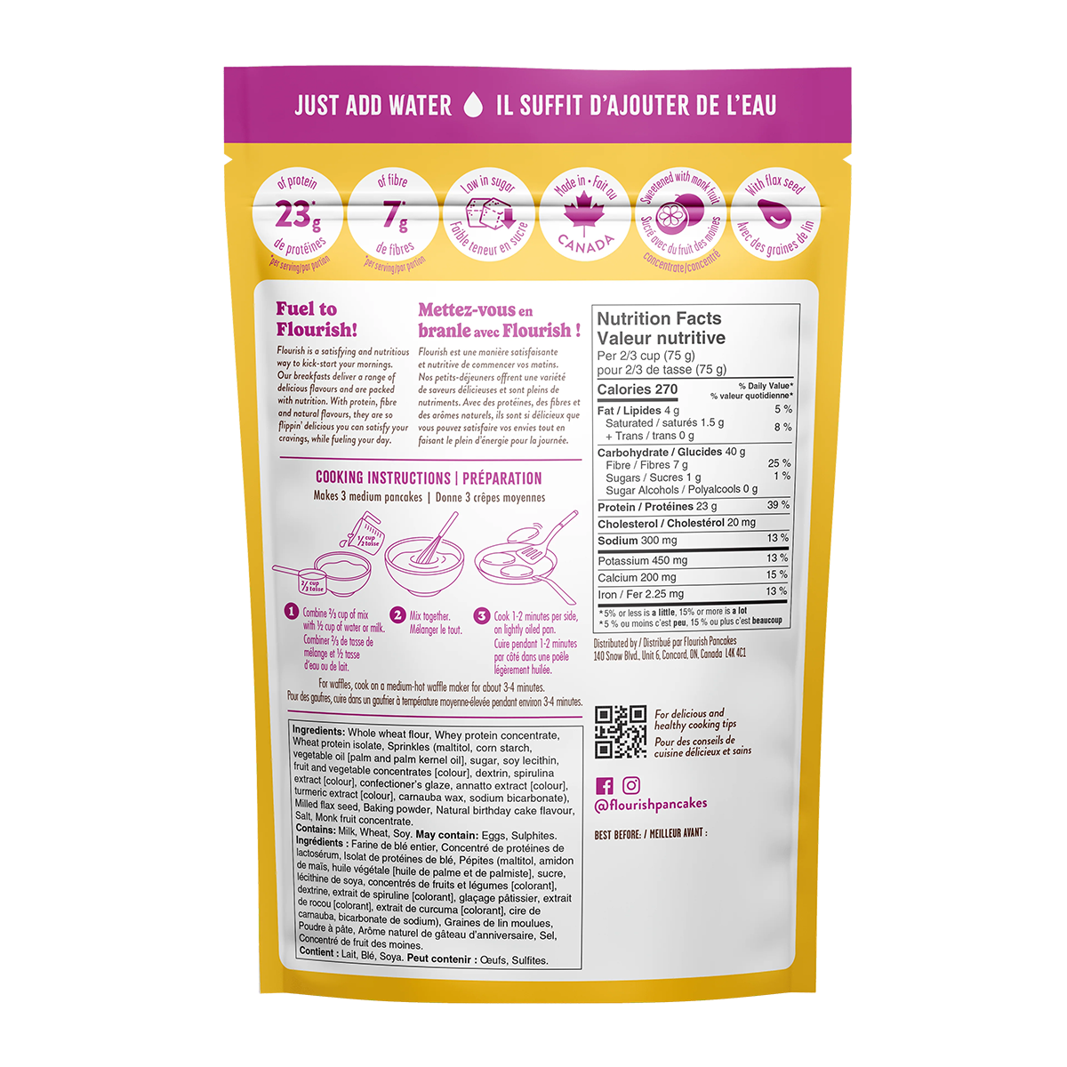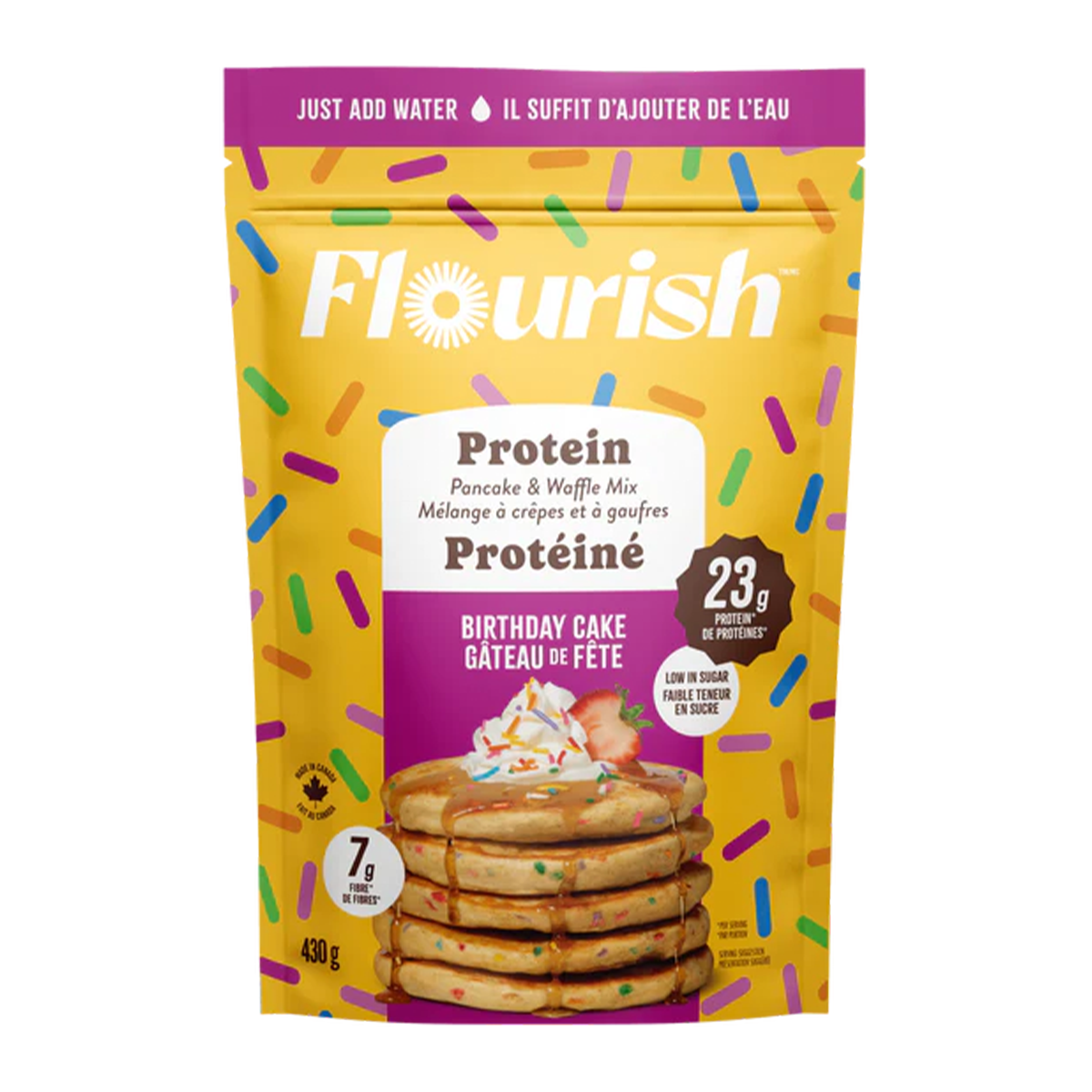 Stacked High Protein - Each serving of Flourish Birthday Cake protein pancakes contains 23 grams of protein, 7 grams of fiber and 1 gram of sugar! Packed with whey protein, this will give you a high-protein breakfast that tastes great and will Assist you stay full until lunch. Say goodbye to mid-morning crashes.