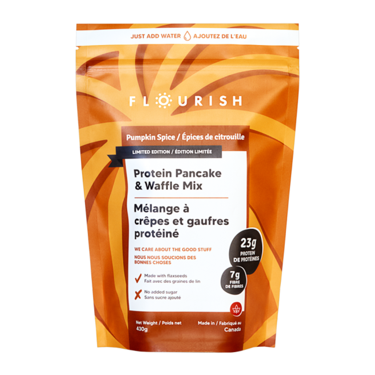 Flourish Protein Pancake & Waffle Mix in Pumpkin Spice flavor is crafted with flaxseeds and contains no added sugar. Each serving provides 23g of protein and 7g of fiber.