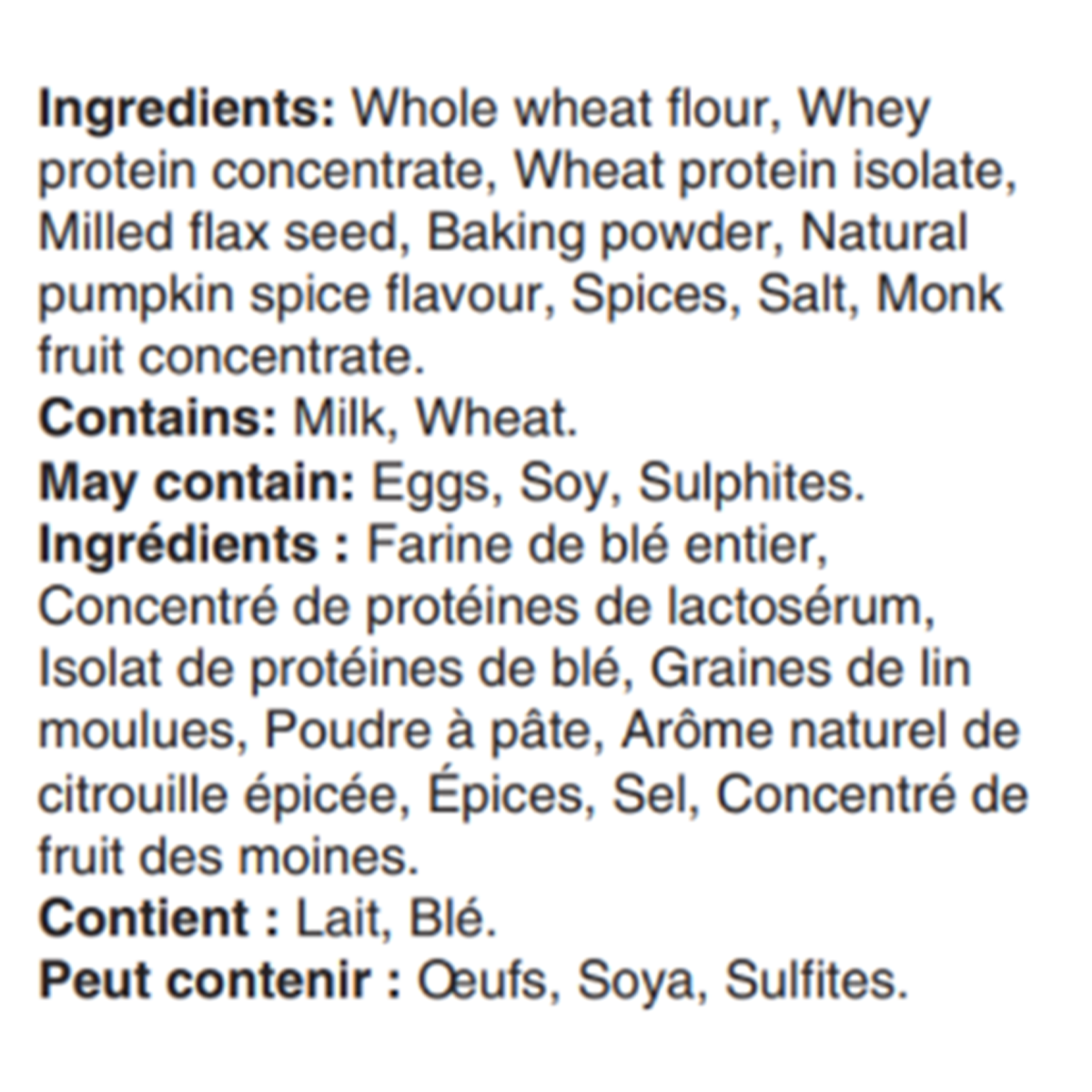 Whole wheat flour, Whey protein concentrate, Wheat protein isolate, Milled flax seed, Baking powder, Natural pumpkin spice flavour, Spices, Salt, Monk fruit concentrate.