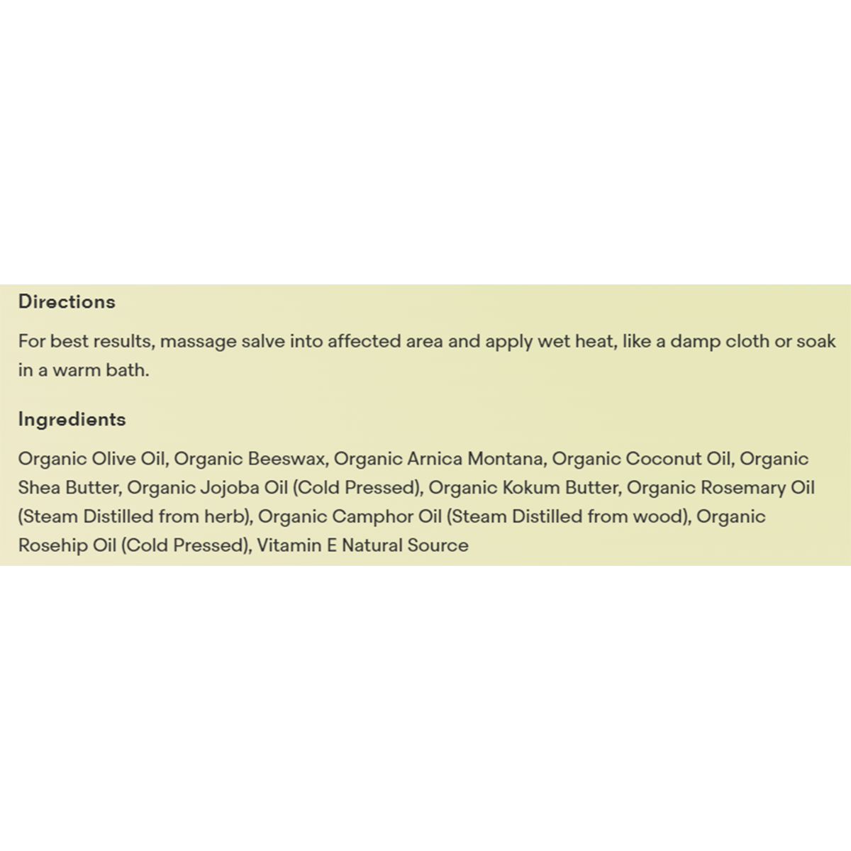 For best results, massage salve into affected area and apply wet heat, like a damp cloth or soak in a warm bath.