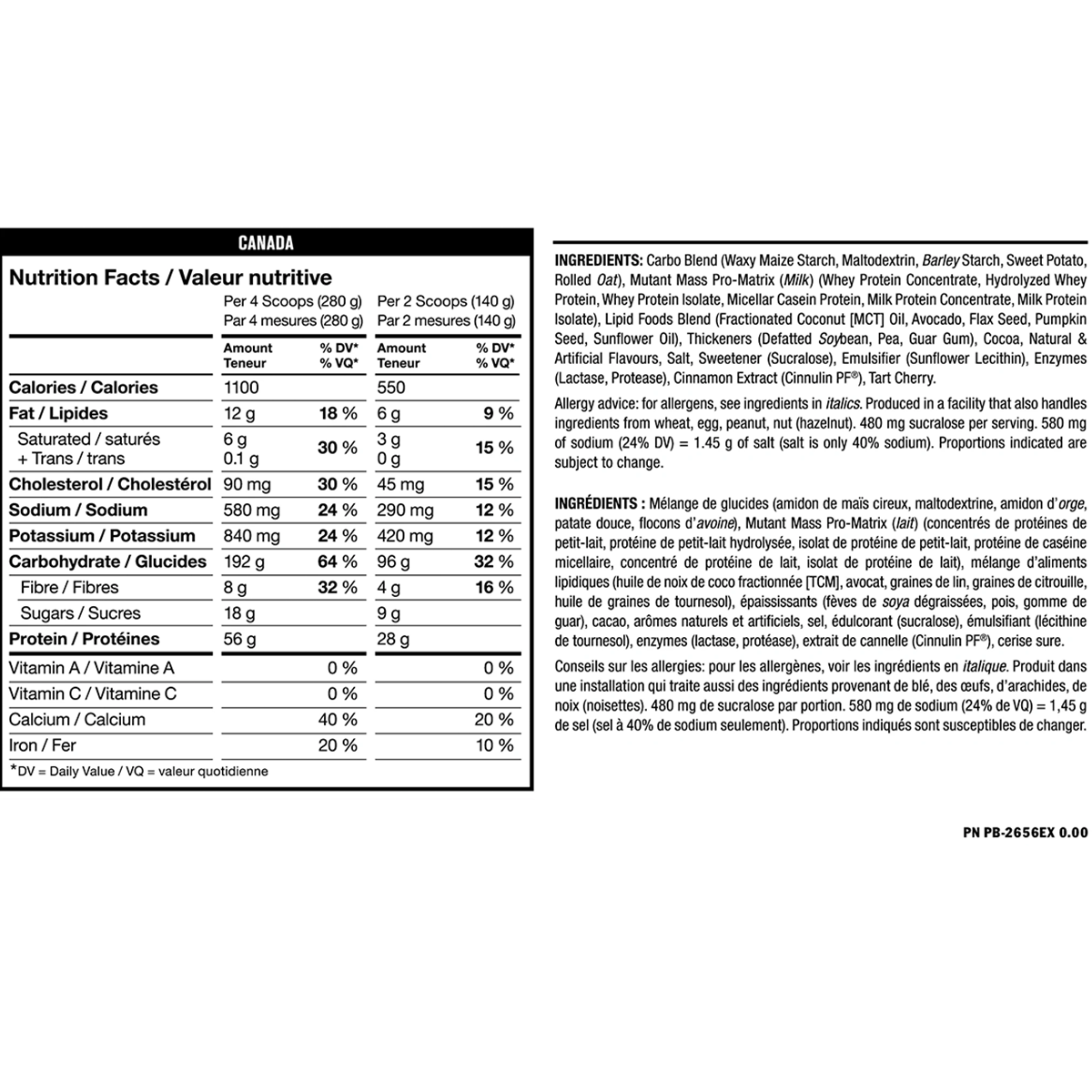 Carbo Blend (Waxy Maize Starch, Maltodextrin, Barley Starch, Sweet Potato, Rolled Oat), Mutant Mass Pro-Matrix (Milk) (Whey Protein Concentrate, Hydrolyzed Whey Protein, Whey Protein Isolate, Micellar Casein Protein, Milk Protein Concentrate, Milk Protein Isolate), Lipid Foods Blend (Fractionated Coconut [MCT] Oil, Avocado, Flax Seed, Pumpkin Seed, Sunflower Oil). Thickeners (Defatted Soybean, Pea, Guar Gum), Cocoa, Natural & Artificial Flavours, Salt, Sweetener (Sucralose), Emulsifier (Sunflower Lecithin), Enzymes (Lactase, Protease), Cinnamon Extract (Cinnulin PF), Tart Cherry.