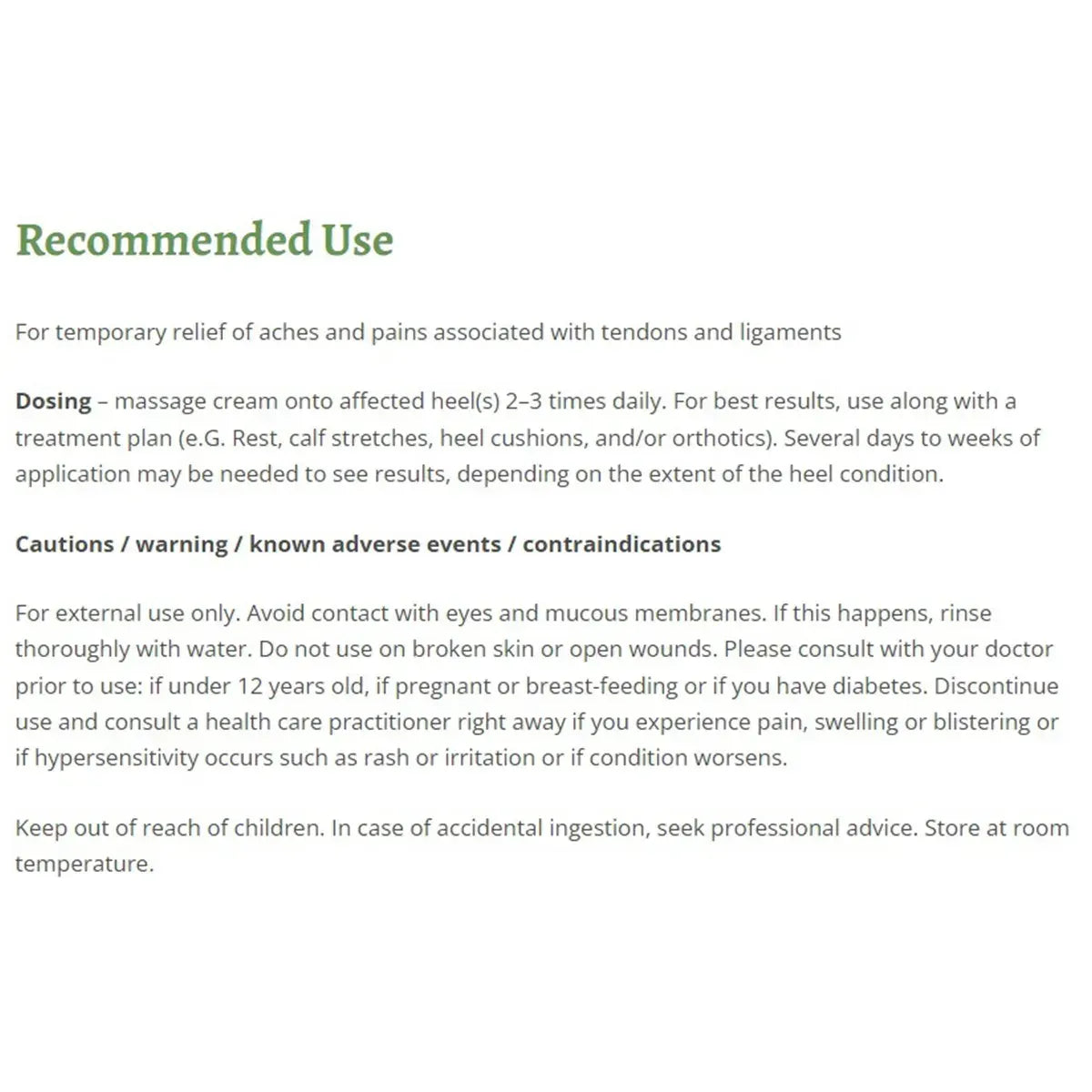 Dosing – massage cream onto affected heel(s) 2–3 times daily. For best results, use along with a Health-Wellness-Car-e plan (e.G. Rest, calf stretches, heel cushions, and/or orthotics). Several days to weeks of application may be needed to see results, depending on the extent of the heel condition.