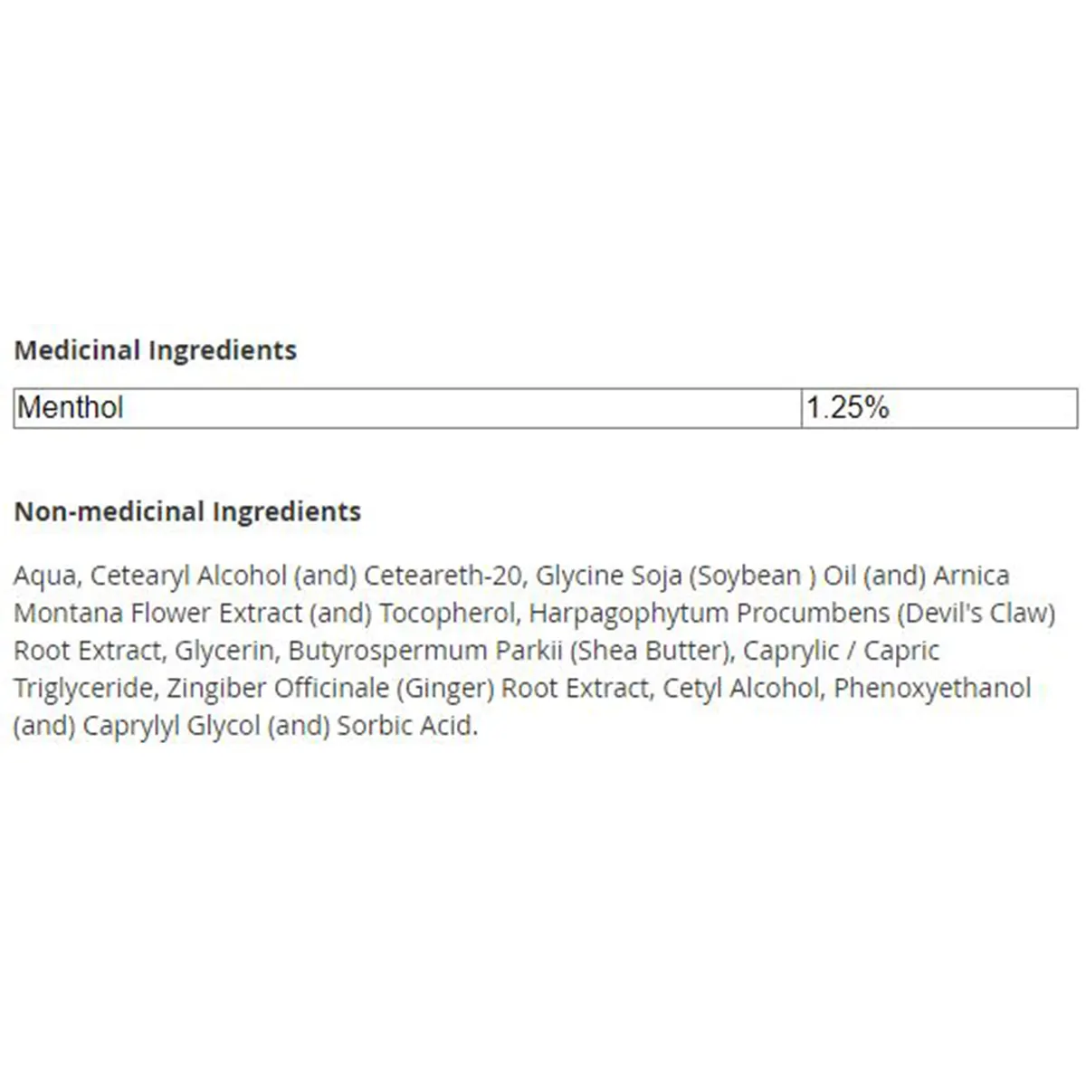 Aqua, Cetearyl Alcohol (and) Ceteareth-20, Glycine Soja (Soybean ) Oil (and) Arnica Montana Flower Extract (and) Tocopherol, Harpagophytum Procumbens (Devil's Claw) Root Extract, Glycerin, Butyrospermum Parkii (Shea Butter), Caprylic / Capric Triglyceride, Zingiber Officinale (Ginger) Root Extract, Cetyl Alcohol, Phenoxyethanol (and) Caprylyl Glycol (and) Sorbic Acid.