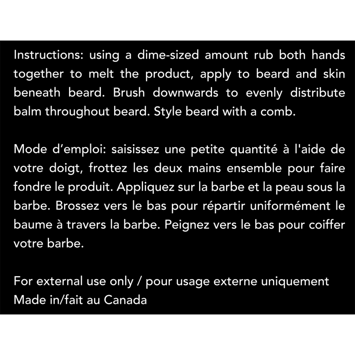 Using a dime-sized amount rub both hands together to melt the product, apply to beard and skin beneath beard. Brush downwards to evenly distribute balm throughout beard. Style beard with a comb.