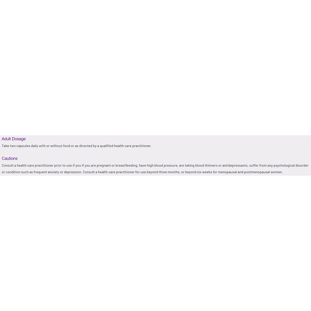 Consult a health Wellness-Care practitioner prior to use if you if you are pregnant or breastfeeding, have high blood pressure, are taking blood thinners or antidepressants, suffer from any psychological disorder or condition such as frequent anxiety or depression. Consult a health Wellness-Care practitioner for use beyond three months, or beyond six weeks for menopausal and postmenopausal women.