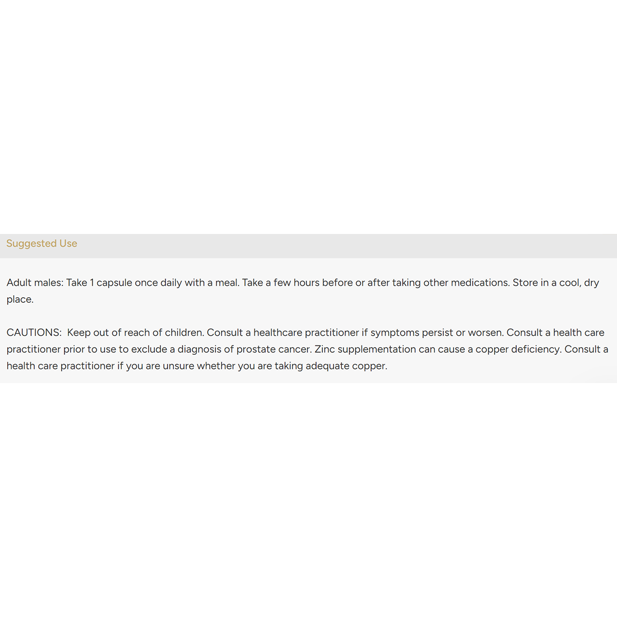 Keep out of reach of children. Consult a health-care practitioner if symptoms persist or worsen. Consult a health Wellness-Care practitioner prior to use to exclude a diagnosis of prostate cancer. Zinc supplementation can cause a copper deficiency. Consult a health Wellness-Care practitioner if you are unsure whether you are taking adequate copper.