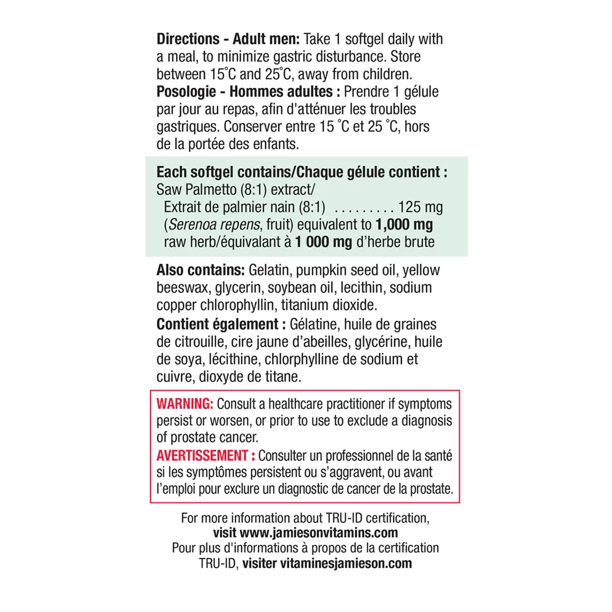 Saw Palmetto (8:1) extract/ Extrait de palmier nain (8:1) (Serenoa repens, fruit) equivalent to 1,000 mg raw herb