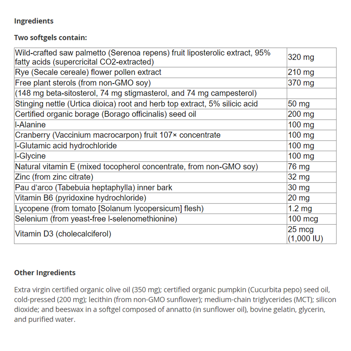 Extra virgin certified organic olive oil (350 mg); certified organic pumpkin (Cucurbita pepo) seed oil, cold-pressed (200 mg); lecithin (from non-GMO sunflower); medium-chain triglycerides (MCT); silicon dioxide; and beeswax in a softgel composed of annatto (in sunflower oil), bovine gelatin, glycerin, and purified water.
