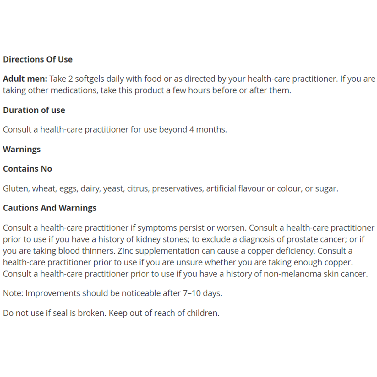 Consult a health-wellness-care practitioner if symptoms persist or worsen. Consult a health-wellness-care practitioner prior to use if you have a history of kidney stones; to exclude a diagnosis of prostate cancer; or if you are taking blood thinners. Zinc supplementation can cause a copper deficiency. Consult a health-wellness-care practitioner prior to use if you are unsure whether you are taking enough copper. Consult a health-wellness-care practitioner prior to use if you have a history of non-melanoma skin cancer.