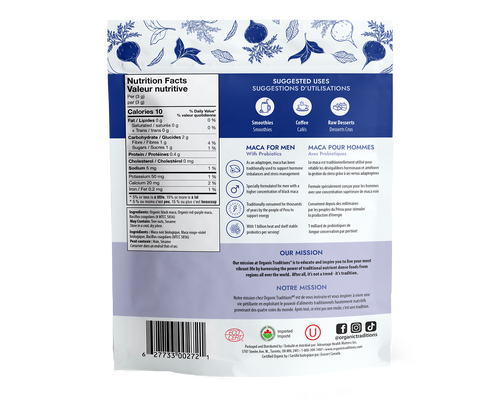 Organic black maca, Organic red-purple maca, Bacillus coagulans (# MTCC 5856).