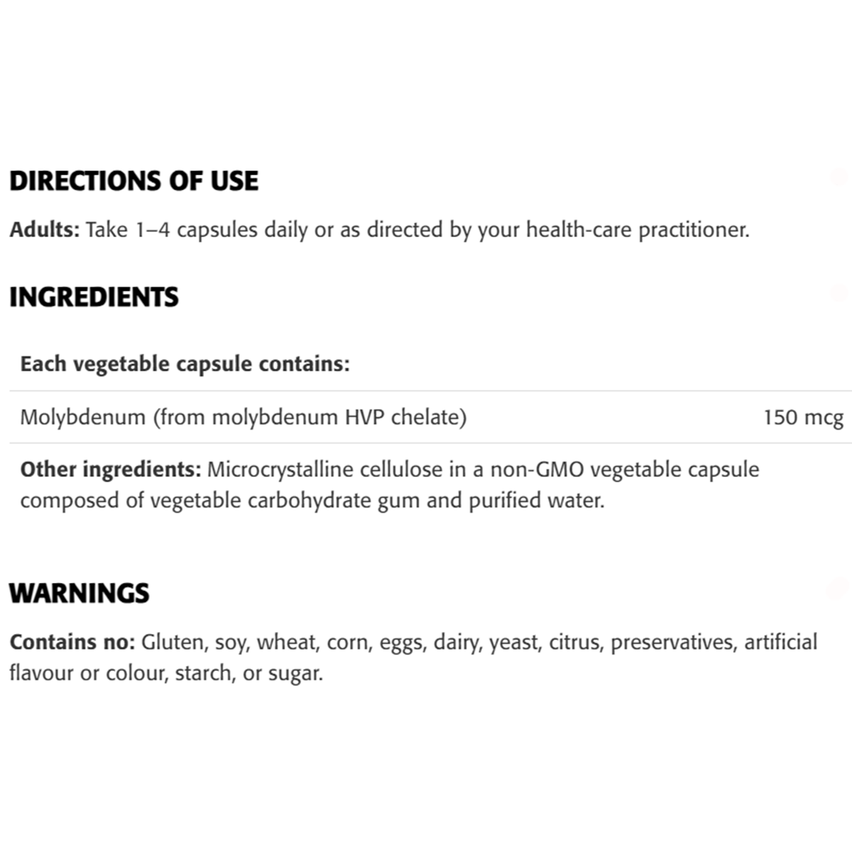 For anyone looking for a trustworthy molybdenum supplement, this is it. The fact that it's free from gluten and dairy is a huge bonus.