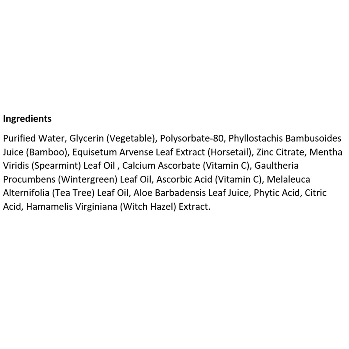 Purified Water, Glycerin (Vegetable), Polysorbate-80, Phyllostachis Bambusoides Juice (Bamboo), Equisetum Arvense Leaf Extract (Horsetail), Zinc Citrate, Mentha Viridis (Spearmint) Leaf Oil, Calcium Ascorbate (Vitamin C), Gaultheria Procumbens (Wintergreen) Leaf Oil, Ascorbic Acid (Vitamin C), Melaleuca Alternifolia (Tea Tree) Leaf Oil, Aloe Barbadensis Leaf Juice, Phytic Acid, Citric Acid, Hamamelis Virginiana (Witch Hazel) Extract.
