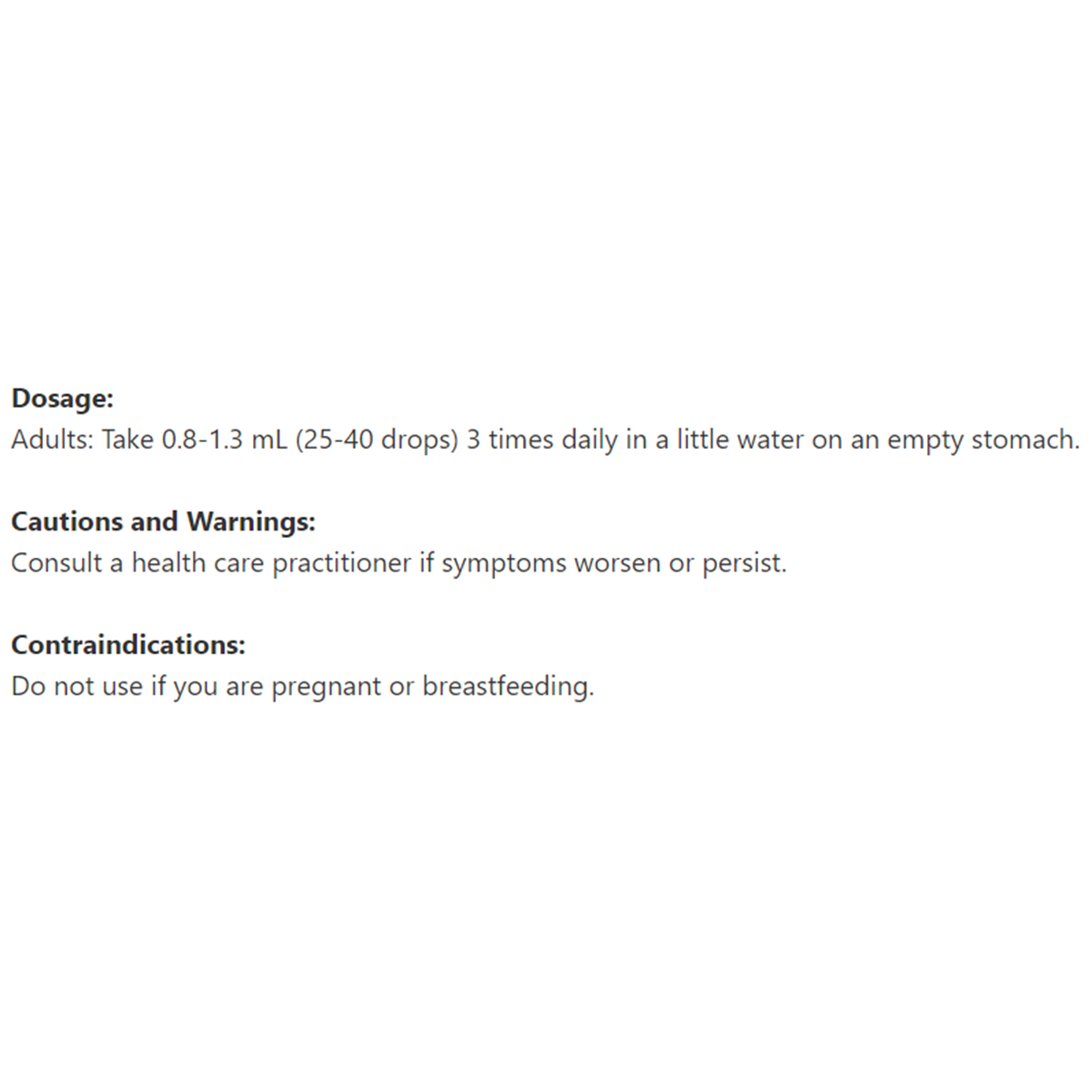 Adults: Take 0.8-1.3 mL (25-40 drops) 3 times daily in a little water on an empty stomach.